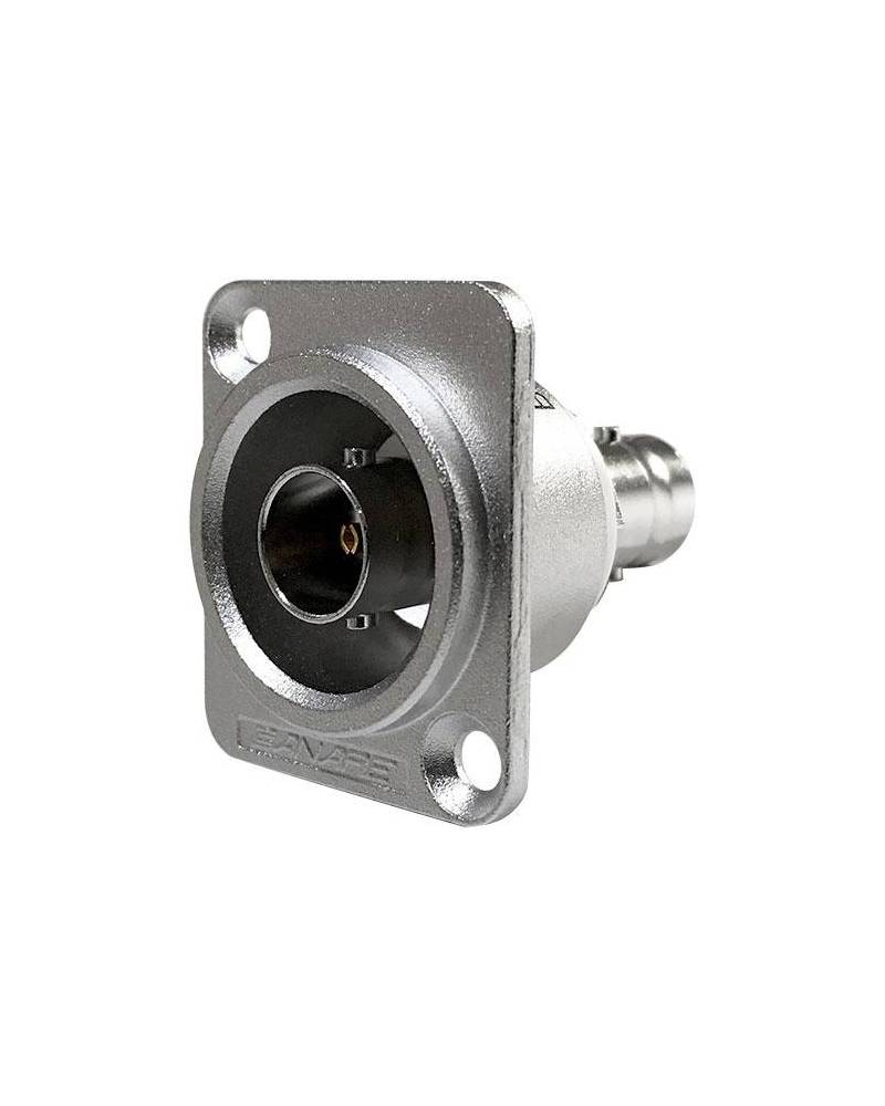 Панельный разъем BNC для аналоговых и цифровых видеосигналов 12G-SDI 4K UHD, проходной, <гнездо/мама> - <гнездо/мама>, фланец D-типа, металлический никелированный корпус, диэлектрик (PTFE), центральный контакт - покрытие золото, 75 Ом. Обратные потери 15 dB при частоте 12.0 гГц.