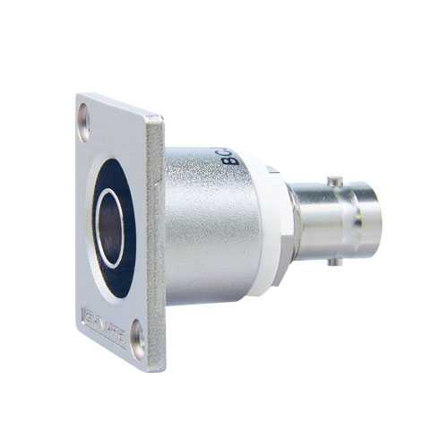 Панельный разъем BNC для аналоговых и цифровых видеосигналов 12G-SDI 4K UHD, проходной, <гнездо/мама> - <гнездо/мама>, фланец стандарта ITT Cannon, металлический никелированный корпус, диэлектрик (PTFE), центральный контакт - покрытие золото, 75 Ом. Обратные потери 15 dB при частоте 12.0 гГц.