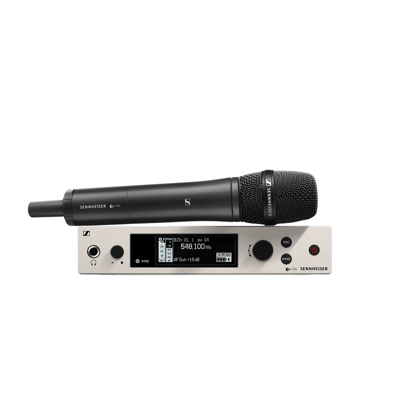 Беспроводная РЧ-система, 470-558 МГц, 32 канала, рэковый приёмник EM 300-500 G4, ручной передатчик SKM 500 G4. Конденсаторный кардиоидный/супер-кардиоидный капсюль MME965-1.