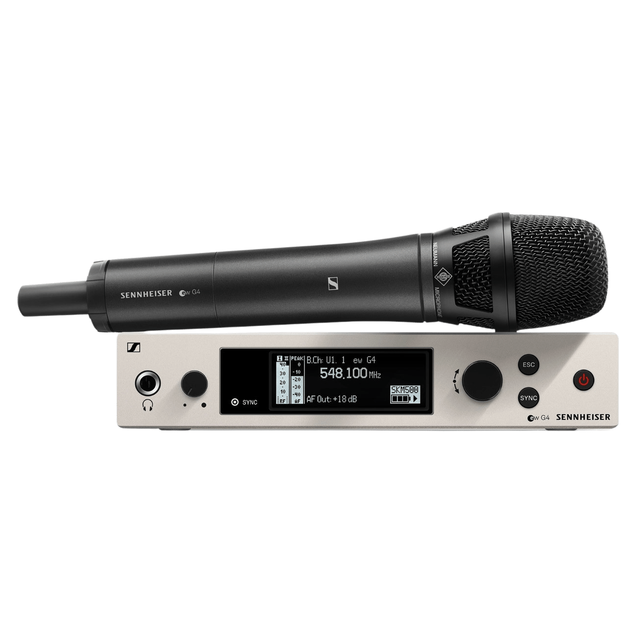 Беспроводная РЧ-система, 470-558 МГц, 32 канала, рэковый приёмник EM 300-500 G4, ручной передатчик SKM 500 G4. Конденсаторный супер-кардиоидный капсюль Neumann KK205.