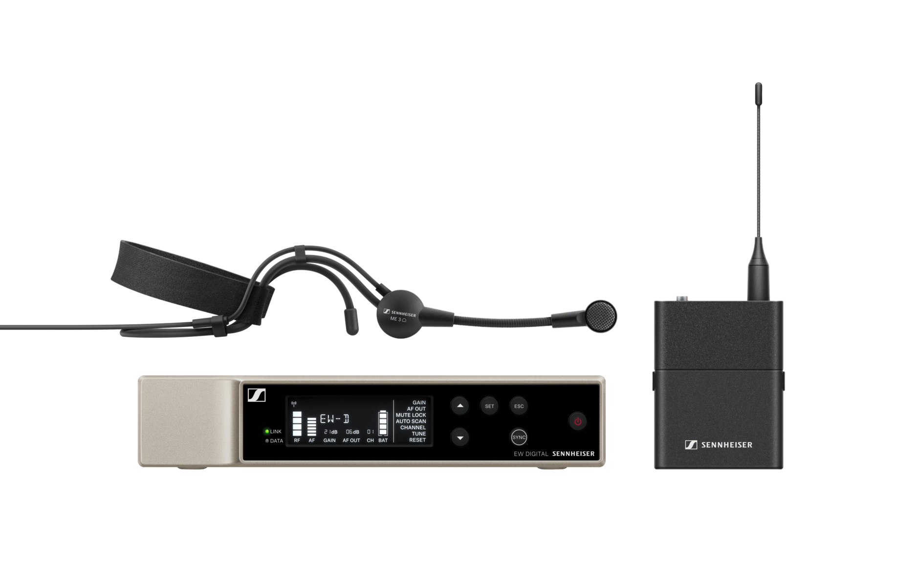Беспроводная цифровая РЧ-система, 470.2-526 МГц, до 90 каналов, рэковый приёмник EW-D EM, поясной передатчик EW-D SK. Головной микрофон ME3 (кардиоида). Управление с помощью приложения Smart Assist app.
