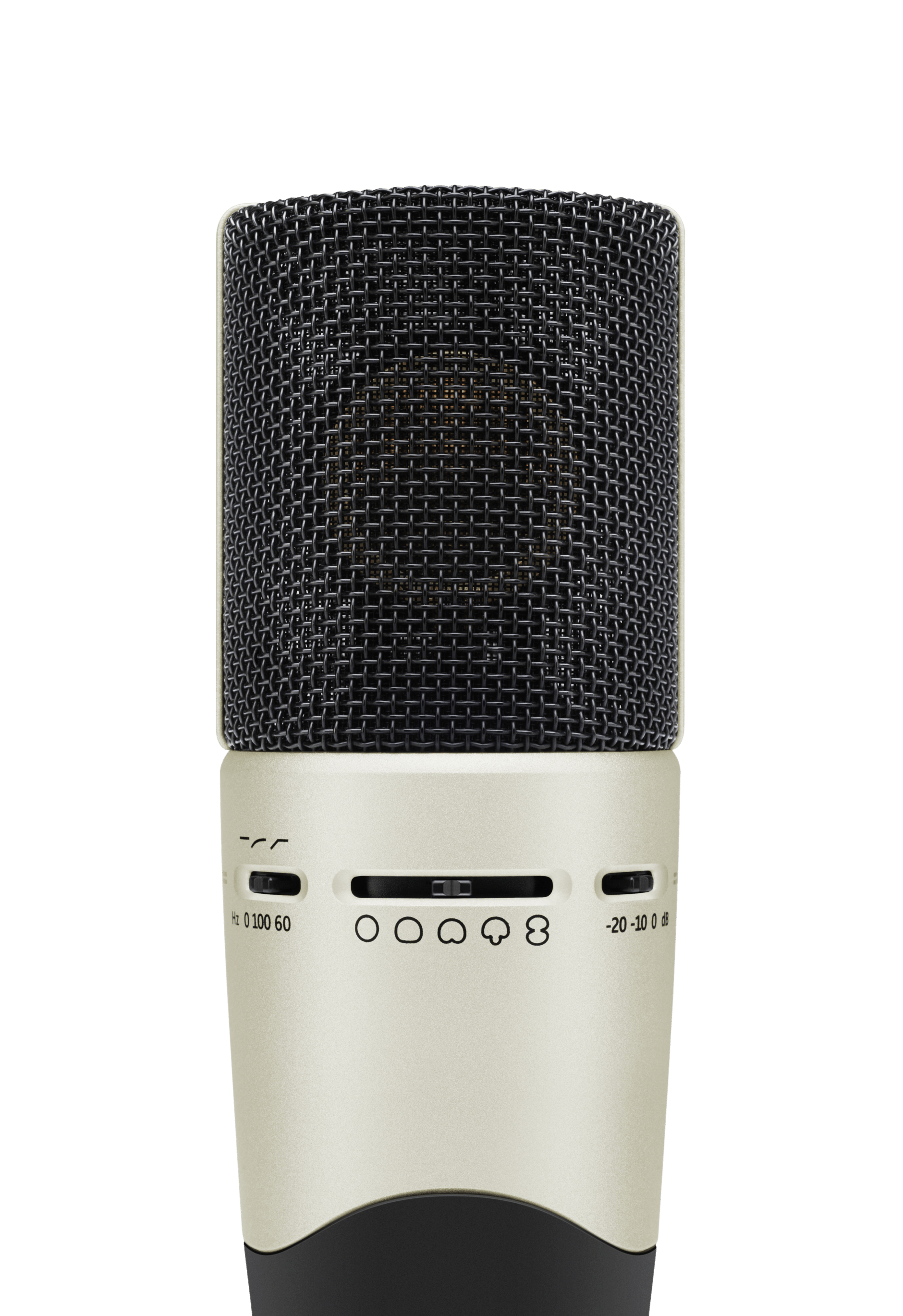 Конденсаторный микрофон с большой мембраной. 5 диаграмм направленности: круг, широкая кардиоида, кардиоида, супер-кардиоида, восьмерка.