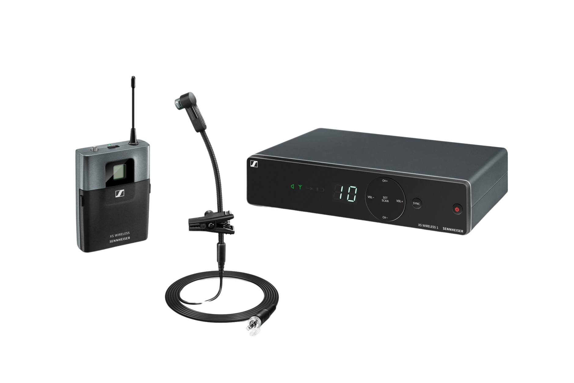 Беспроводной инструментальный комплект. Включает (1) передатчик миниатюрный SK-XSW, (1) E908 T микрофон "гусиная шея" (кардиоида, конденсаторный), (1) Стациональный приемник EM-XSW 1 с внутренними антеннами и (1) NT 12-5 блок питания, диапазон частоты: BC (670-694 МГц)