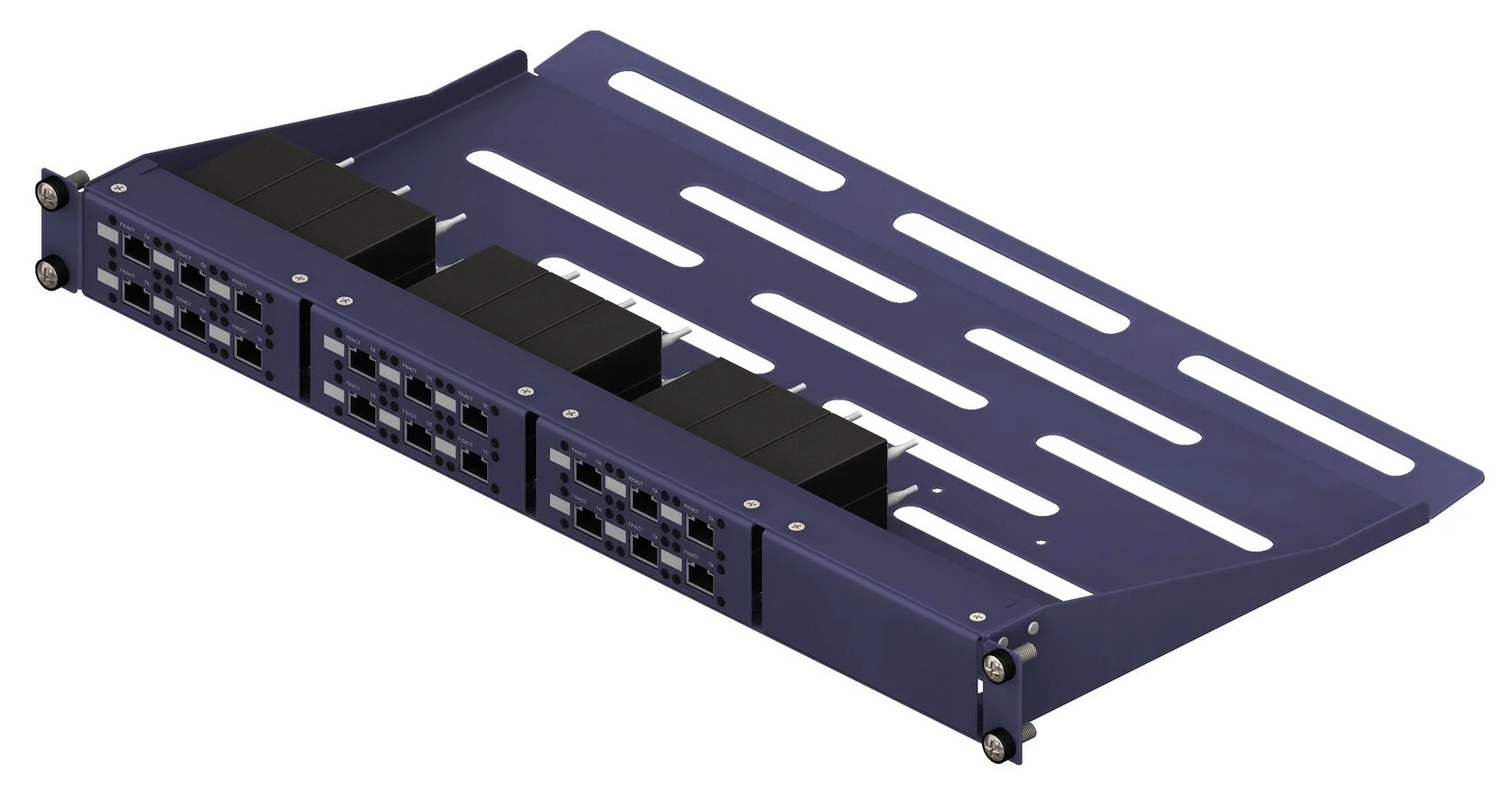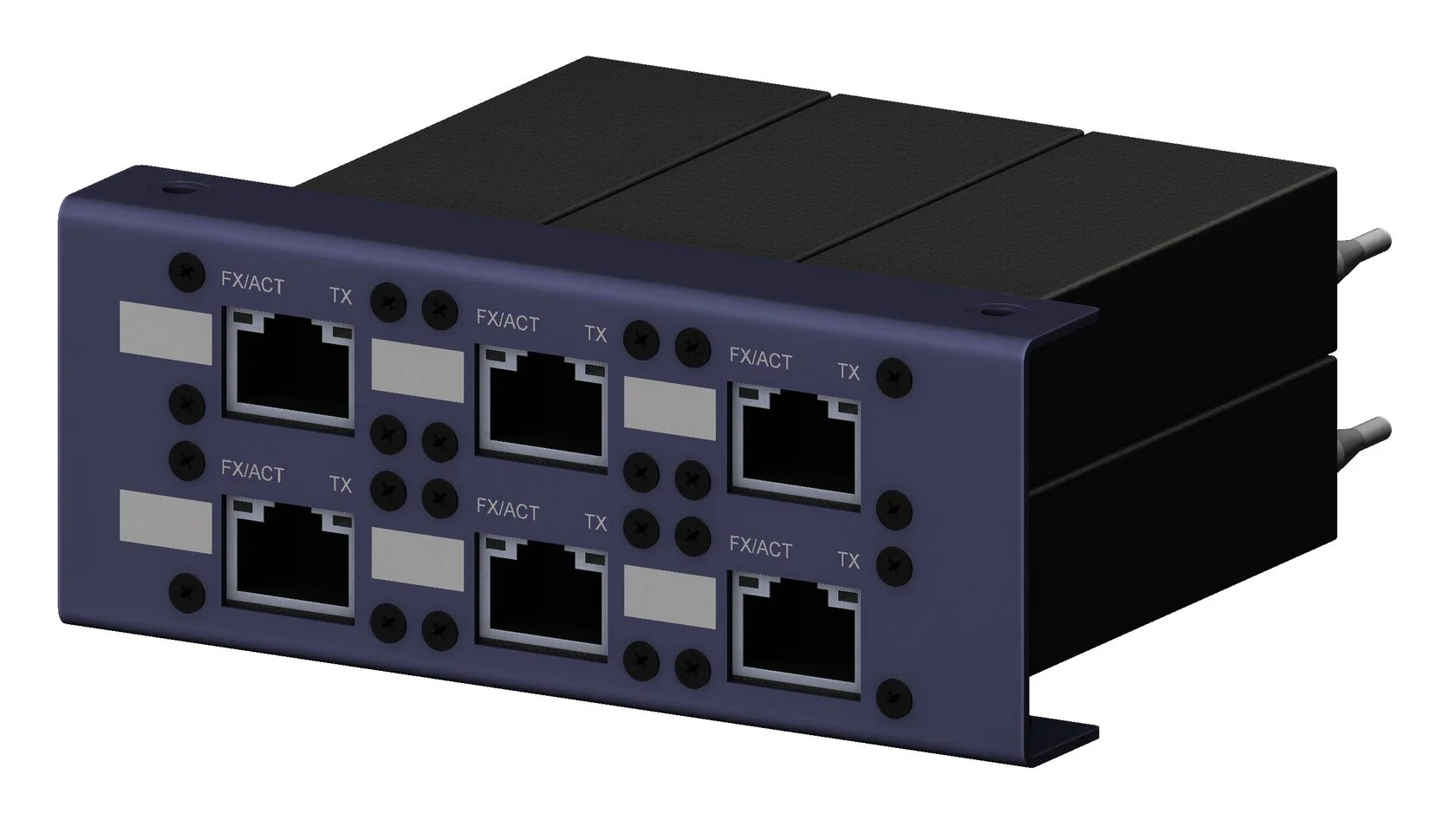 Модульная панель Bosc 41-6E с установленными 6 медиа конвертерами Gigabit Ethernet. Панель снабжена полями для нанесения