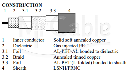 Кабель коаксиальный с малыми потерями, с повышенной помехозащищенностью для аналоговых и цифровых видеосигналов HDTV-SDI/3G/6G/12G, Серия EMC Pro, (3 гб/с одиночный режим до 188 м, 6 гб/с одиночный режим до 161 м. ), тип RG11/U, структура: 1.63/7.11 (1х1.63 мм), проводник - цельный /голая медь, AWG 14, диэлектрик проводника газовспененный полиэтилен (Gas Injected PE), трехслойный экран - алюминиевая фольга + плетеный из луженой меди + алюминиевая фольга по технологии Duobond Plus® (100%+80%+100%), t (-30°C +70°C), диаметр кабеля 10.2 мм, оболочка (FRNC/LSZH-C Dca), стандарт: IEC 60332-1-2, 60332-3-24, 75 Ом
