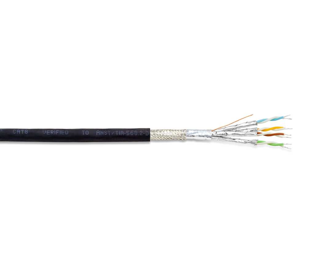 Кабель "Витая пара", CAT 8, скорость передачи данных 40 Гбит/с, структура: 4х2х0.60 (1х0.60 мм), проводник - цельный /луженая медь, 4 пары (22 AWG), частота (2000 MHz), экранированный S/FTP (экран пары - алюминиевый 100% + общий плетеный из луженой меди 30%), t (-20°C +65°C), диаметр кабеля 9.0 мм, оболочка (PVC)