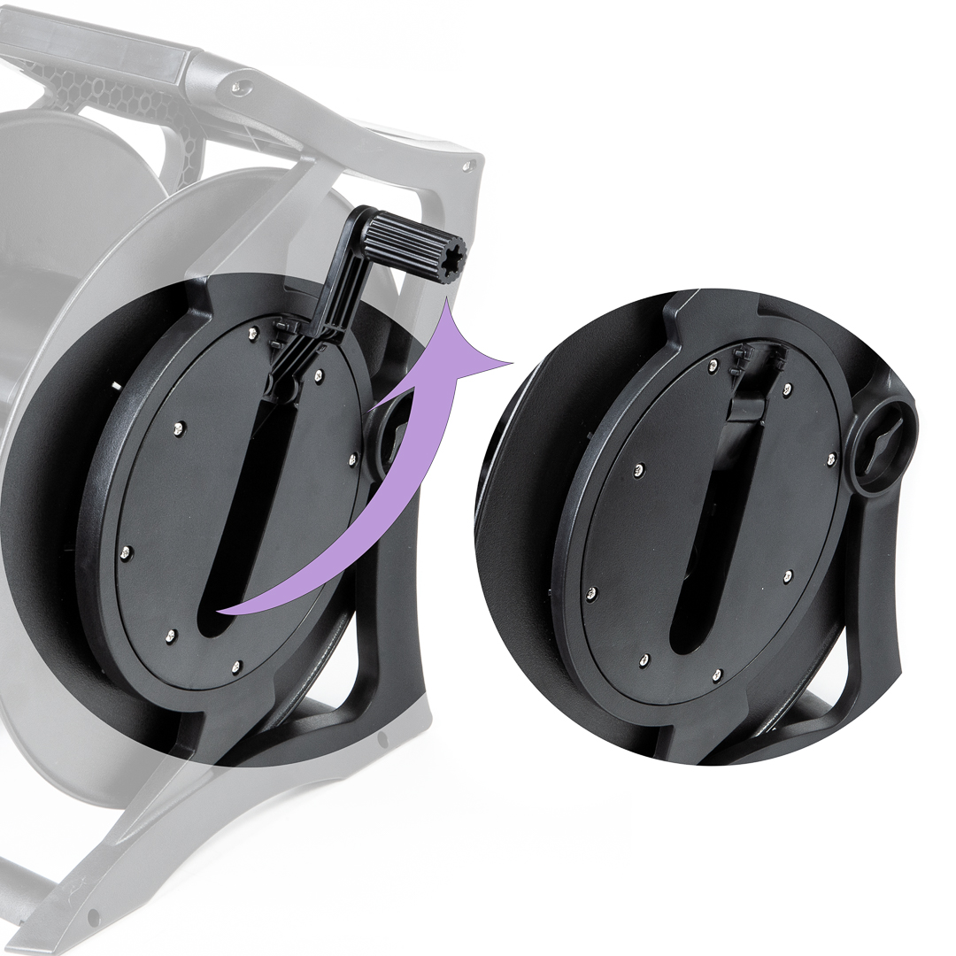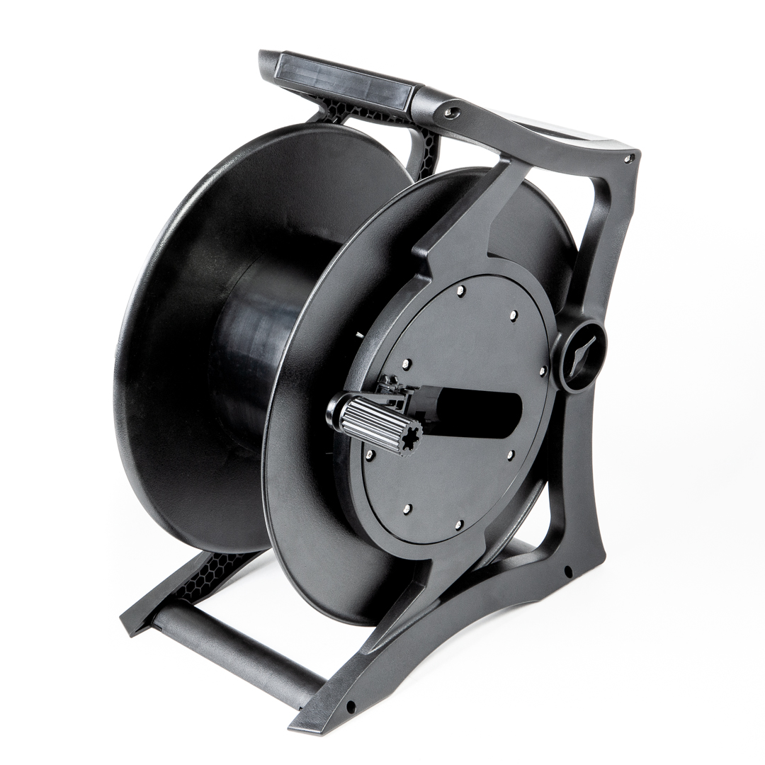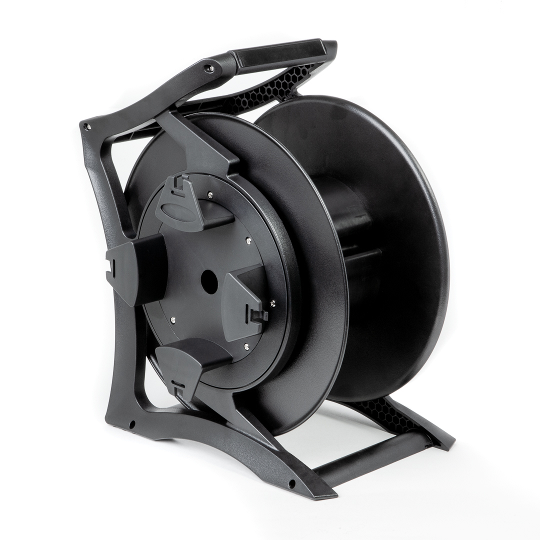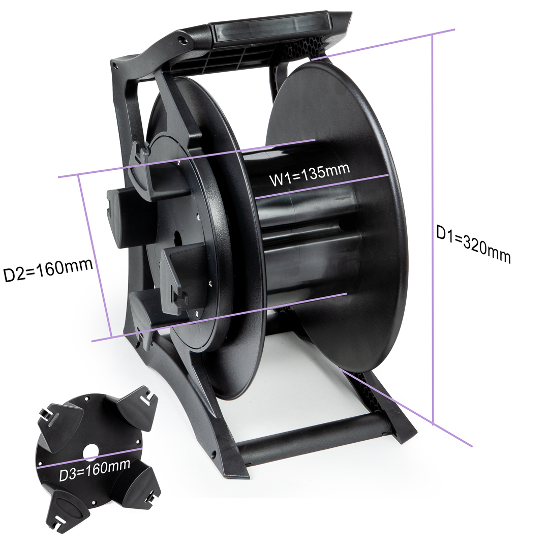 Кабельная катушка рамной конструкции из ударопрочного пластика, так же стойкого к маслам и низким температурам (-30 С). Конструкция со складной ручкой для вращения барабана и стопорный винт. Диаметр внешней щеки 320мм, ширина сердечника 135мм, диаметр 160мм. В базовой комплектации поставляется с торцевой пластиной с "рогами" для парковки внешнего конца кабеля и отверстием для вывода. Габариты(ШхВхГ): 33х35х33 см.