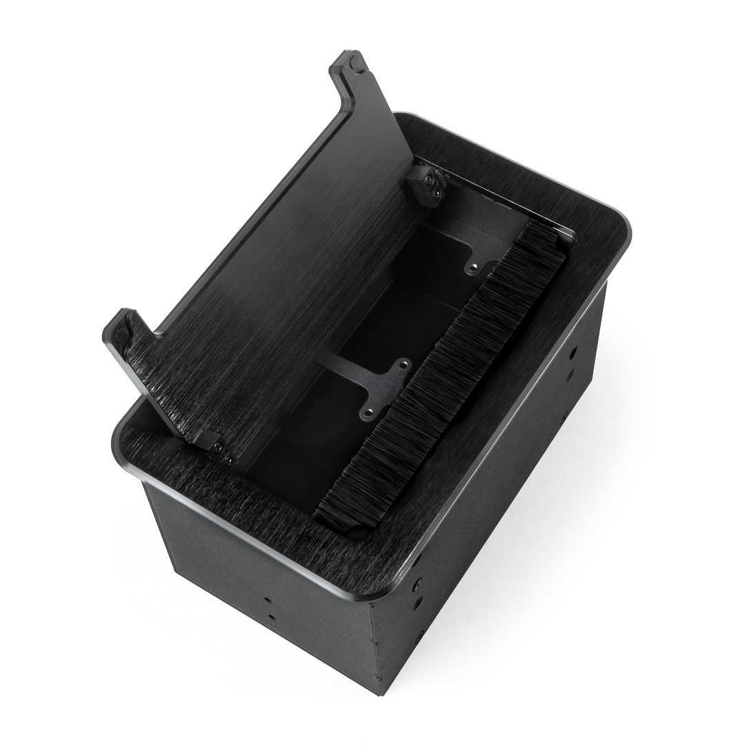 Коммутационный лючок, предназначенный для встройки в поверхность стола или сцены. Габарит (ДхШхГ): 221x130x120 мм. Посадочный размер 190х115 мм. Емкость 2 юнита (панели под разъемы); стальной корпус, откидная крышка с микролифтом