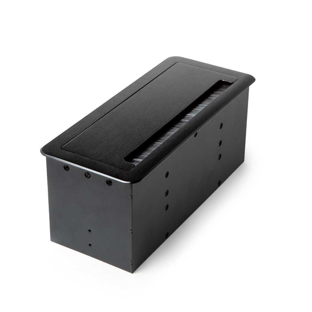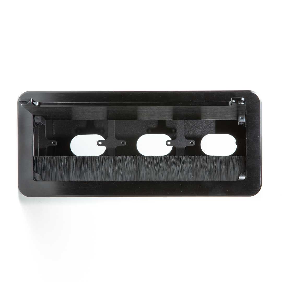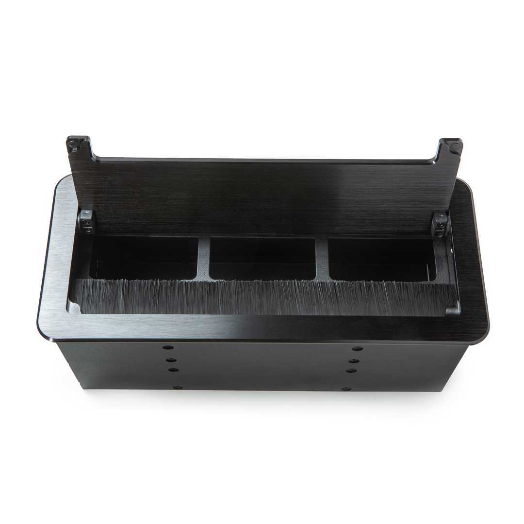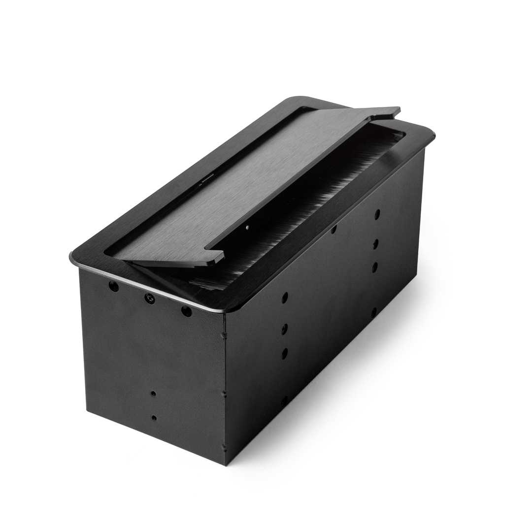 Коммутационный лючок, предназначенный для встройки в поверхность стола или сцены. Габарит (ДхШхГ): 298x130x120 мм. Посадочный размер 280х115 мм. Емкость 3 юнита (панели под разъемы); стальной корпус, откидная крышка с микролифтом