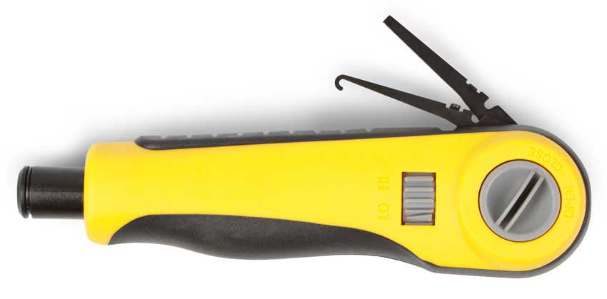 Инструмент профессиональный для заделки контактов (IDC 110/ 66/ 88, плинты LSA), нож в комплект не входит, регулируемый 2-х позиционный ударный механизм, замок Twist-Lock, встроенные крючок и щуп для укладки проводников, материал - металл /термопластичная резина. Применение: заделка жил в кроссы, патч-панели и модули с контактами IDC. Быстрая заделка контактов с одновременной обрезкой жил. Пенал в рукоятке для сменного ножа-вставки. Сменные насадки: HT-14TA, HT-14TBK, HT-14TK. Цвет: жёлтый