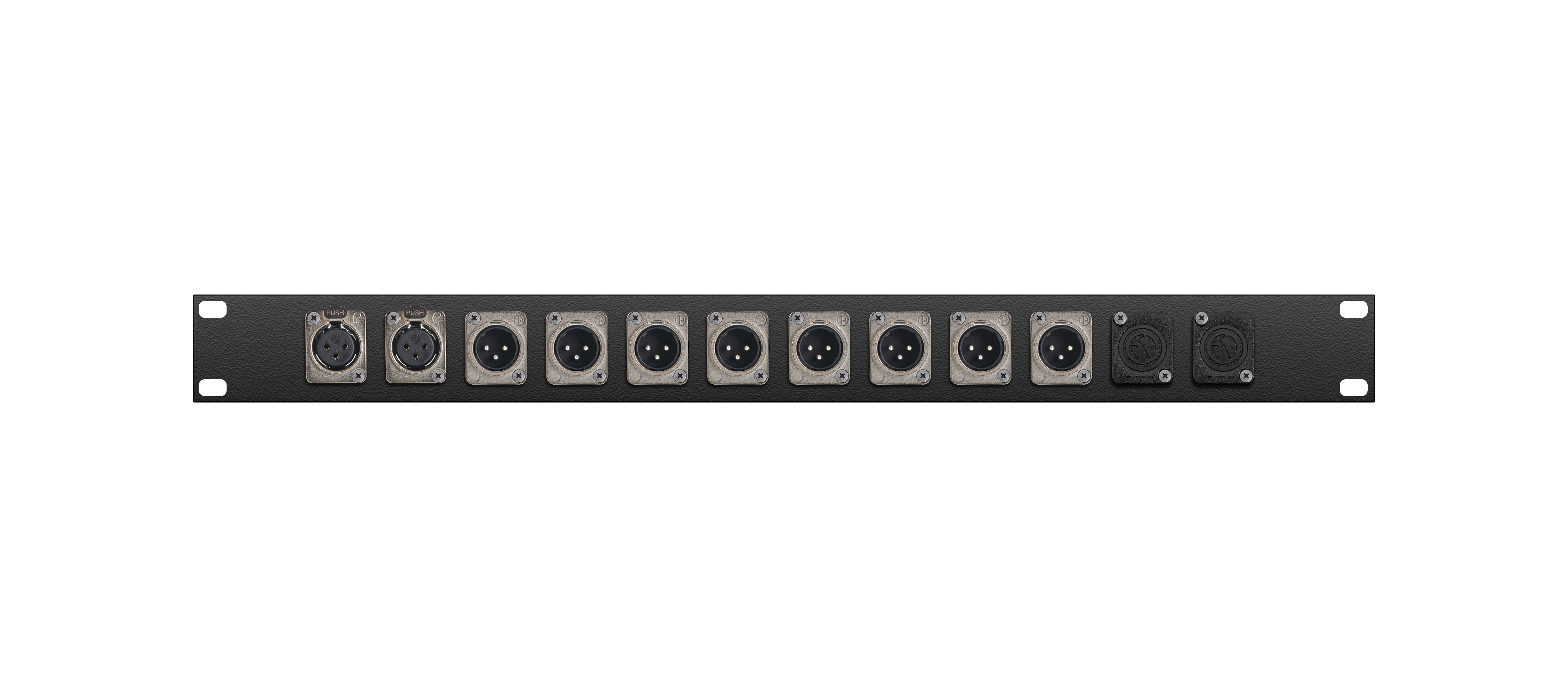 Оконечная аудио панель 10-кан. (2-IN/8-OUT), Standart, (2х XLR гнездо/8х XLR штекер), 1U, 19" для звуковых сигналов-XLR, D-посадка. Комплектующие: разъемы Neutrik NC3FD-L-1; NC3MD-L-1; панель MrCable P1U-12D.