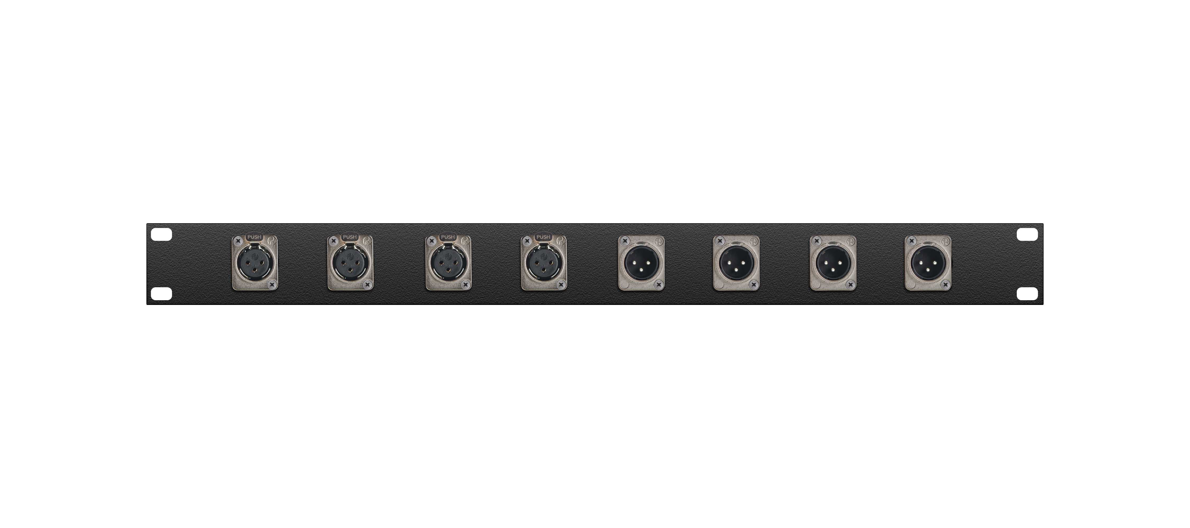 Оконечная аудио панель 8-кан. (4-IN/4-OUT), Standart, (4х XLR гнездо/4х XLR штекер), 1U, 19" для звуковых сигналов-XLR, D-посадка. Комплектующие: разъемы Neutrik NC3FD-L-1; NC3MD-L-1; кабель-трейсер MRC CT-105-JA (глубина 10,5 см); панель MRC ERP1U-08D