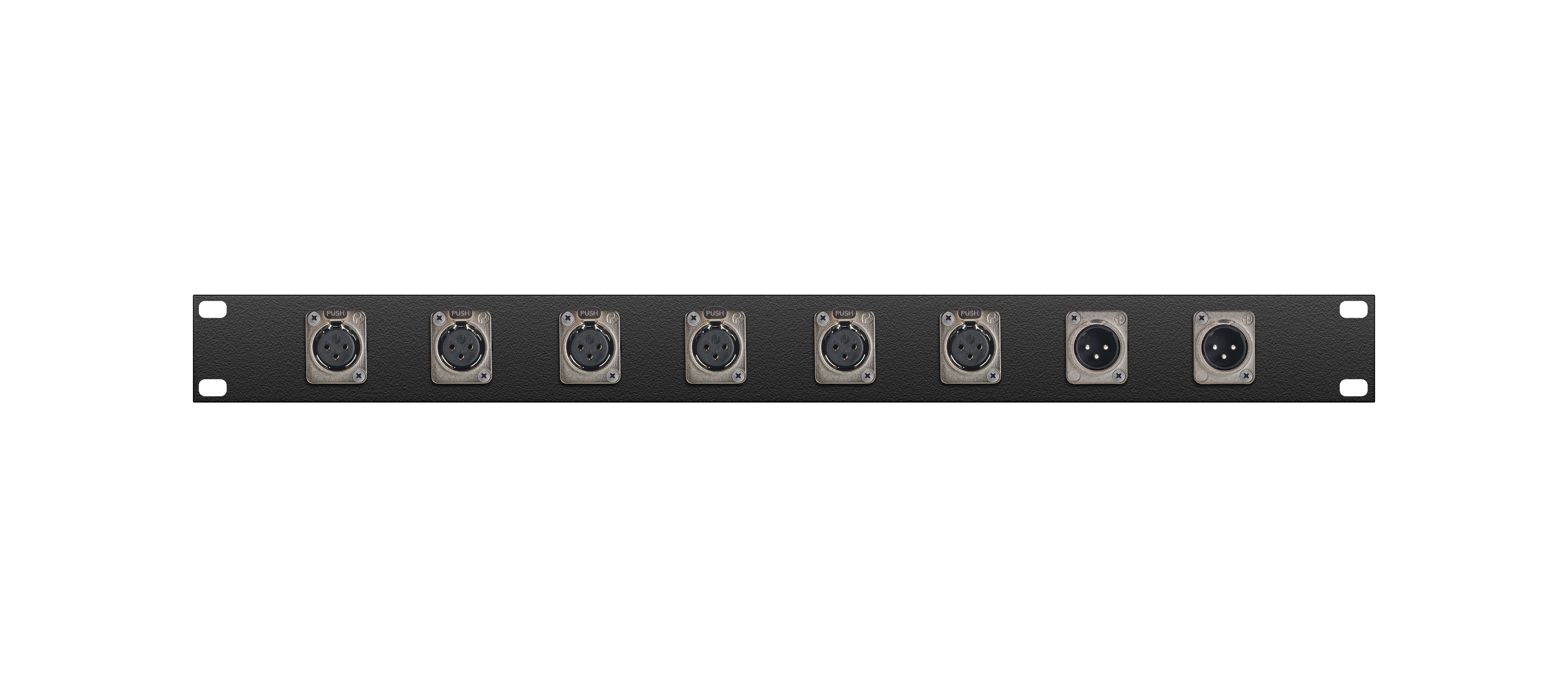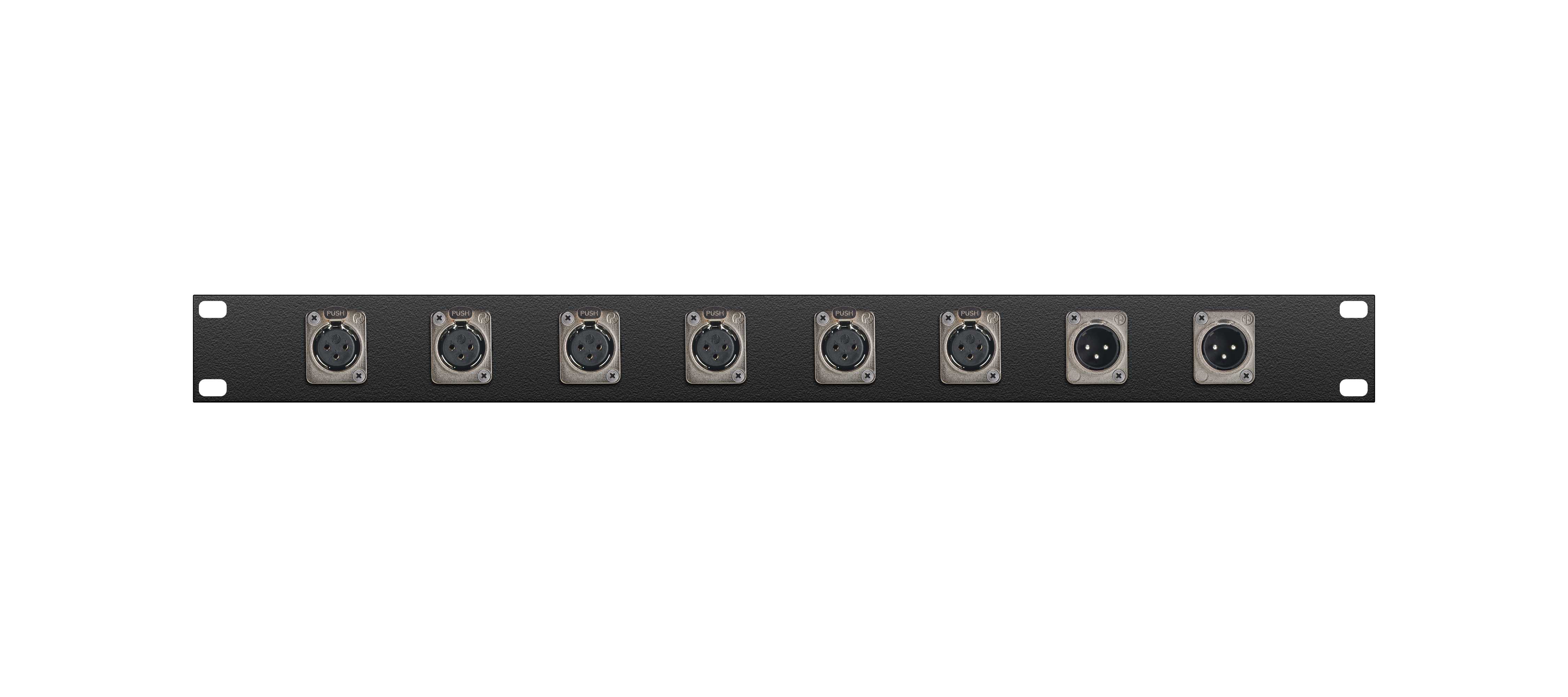 Оконечная аудио панель 8-кан. (6-IN/2-OUT), Standart, (6х XLR гнездо/2х XLR штекер), 1U, 19" для звуковых сигналов-XLR, D-посадка. Комплектующие: разъемы Neutrik NC3FD-L-1; NC3MD-L-1; панель MrCable P1U-08D.