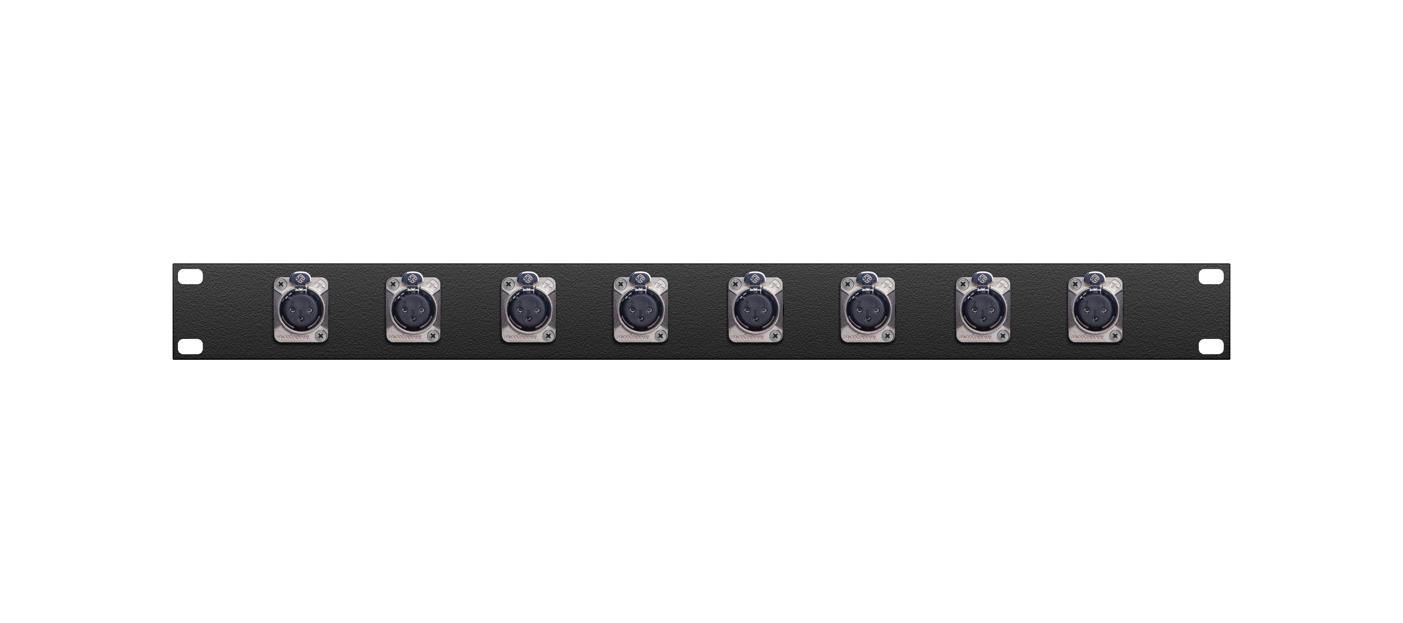 Оконечная аудио панель 8-кан. (8-IN), Econom, (8х XLR гнездо), 1U, 19" для звуковых сигналов-XLR, D-посадка. Комплектующие: разъемы XLR; панель MrCable P1U-08D.