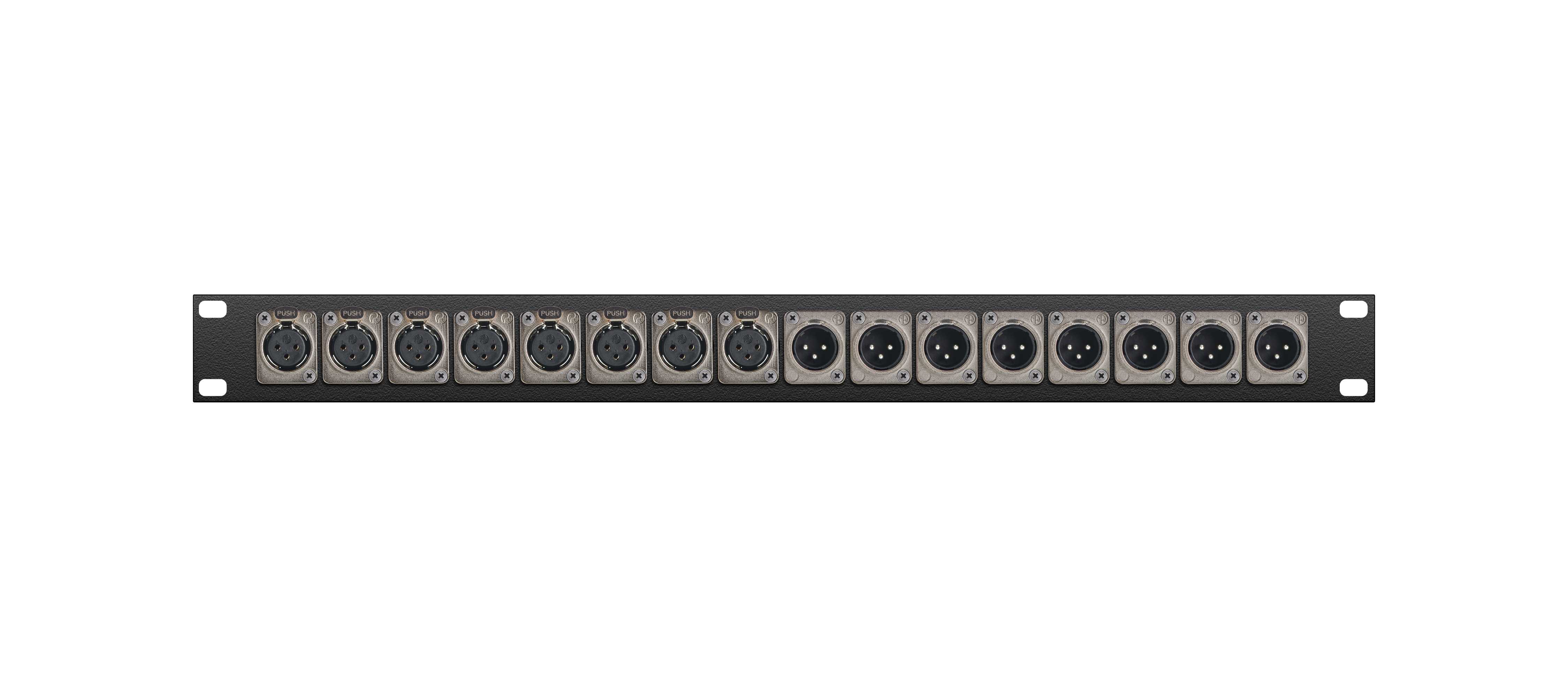 Оконечная аудио панель 16-кан. (8-IN/8-OUT), Standart, (8х XLR гнездо/8х XLR штекер), 1U, 19" для звуковых сигналов-XLR, D-посадка. Комплектующие: разъемы Neutrik NC3FD-L-1; NC3MD-L-1; кабель-трейсер MRC CT-105-JA (глубина 10,5 см); панель MRC ERP1U-16D