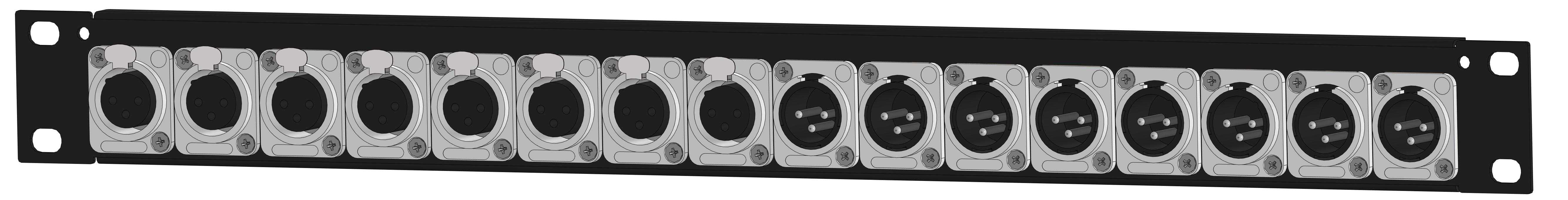 Оконечная аудио панель 16-кан. (8-IN/8-OUT), Standart, (8х XLR гнездо/8х XLR штекер), 1U, 19" для звуковых сигналов-XLR, D-посадка. Комплектующие: разъемы MRC RXDN-3F; MRC RXDN-3M; кабель-трейсер MRC CT-105-JA (глубина 10,5 см); панель MRC ERP1U-16D