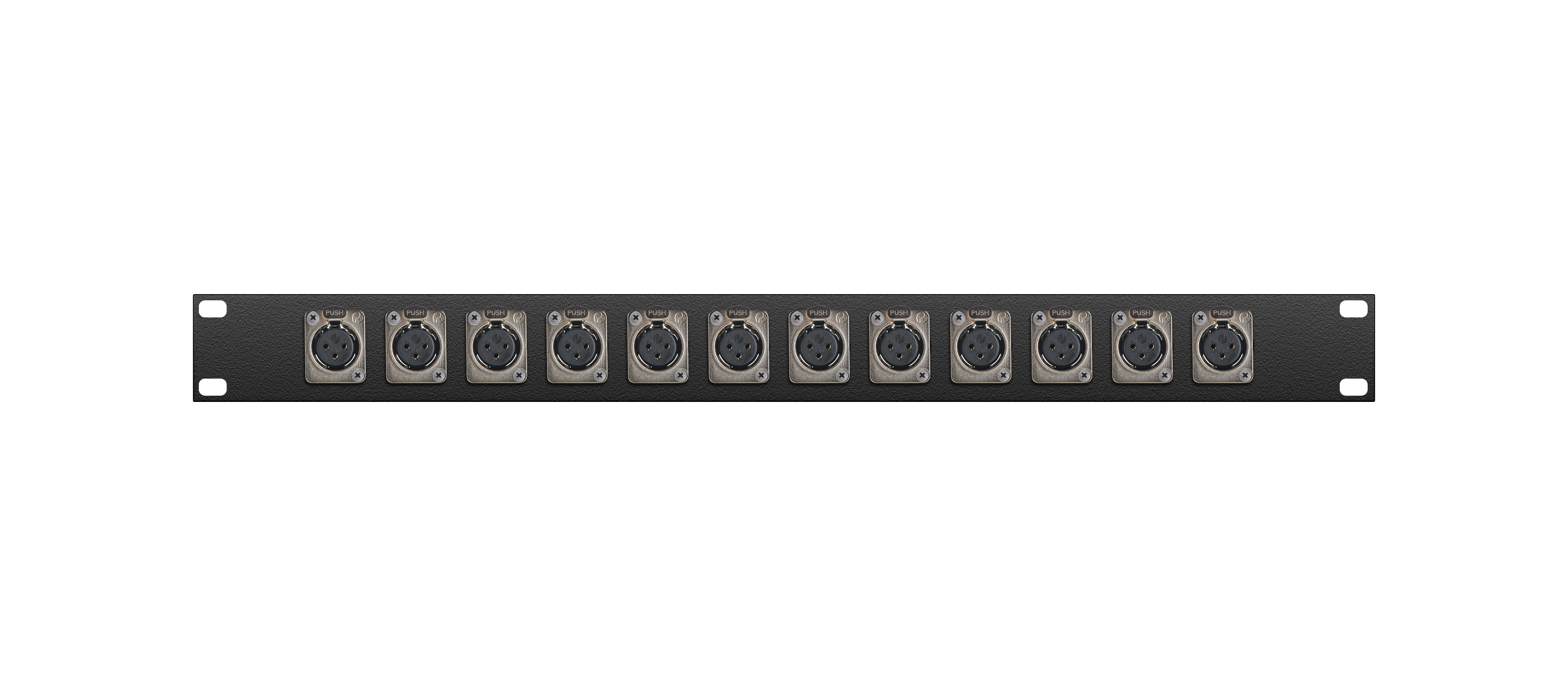 Оконечная аудио панель 12-кан. (12-IN), Standart, (12Х XLR гнездо), 1U, 19" для звуковых сигналов-XLR, D-посадка. Комплектующие: разъемы Neutrik NC3FD-L-1; панель MrCable P1U-12D.