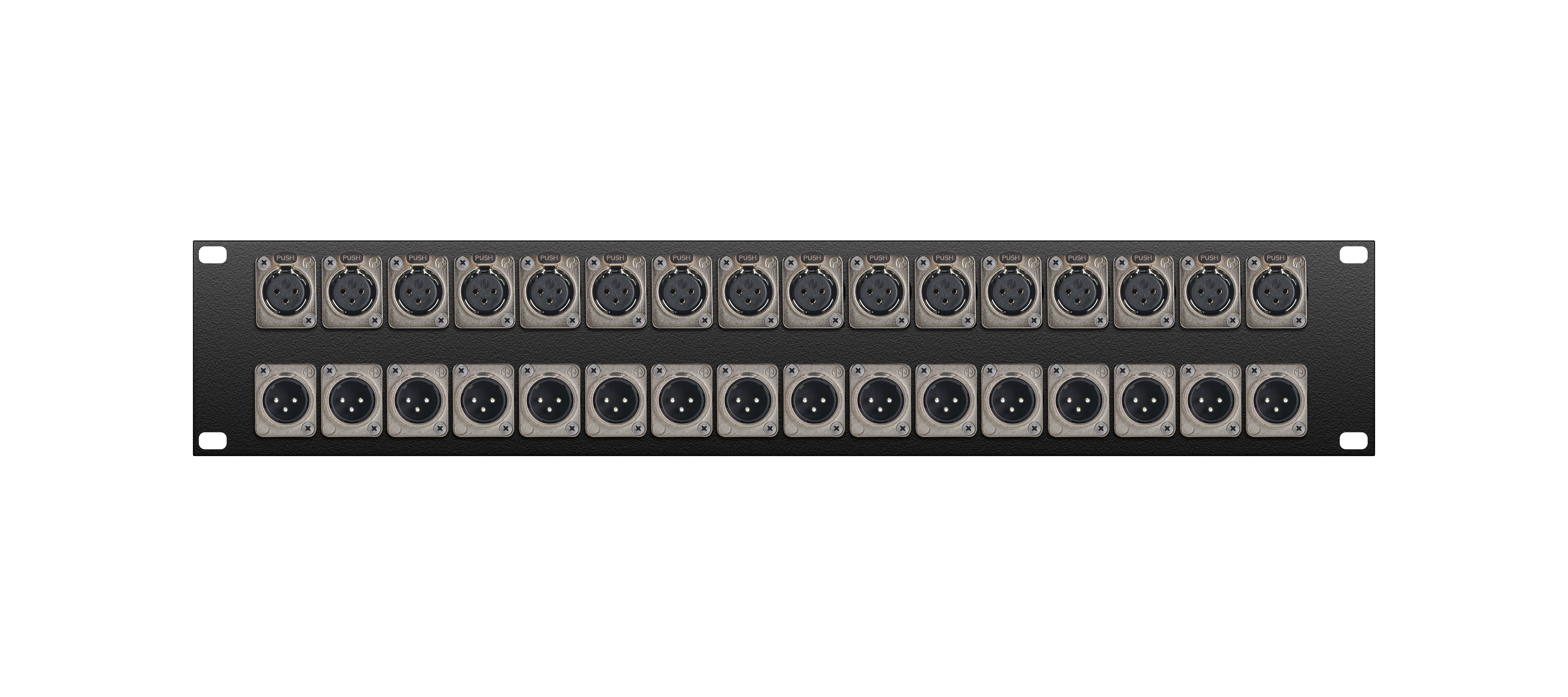 Оконечная аудио панель 32-кан. (16-IN/16-OUT), Standart, (16х XLR гнездо/16х XLR штекер), 2U, 19" для звуковых сигналов-XLR, D-посадка. Комплектующие: разъемы Neutrik NC3FD-L-1; NC3MD-L-1; панель MrCable P2U-32D.
