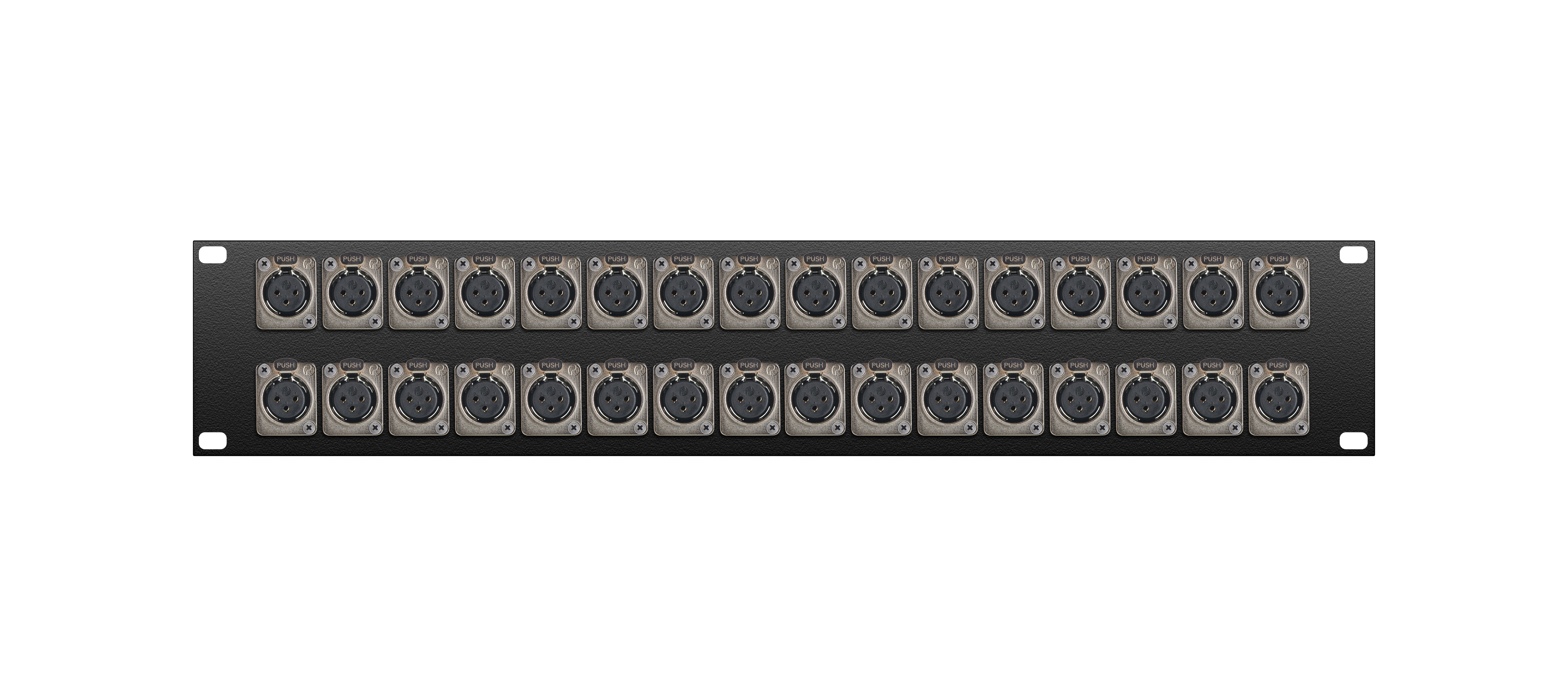 Оконечная аудио панель 32-кан. (32-IN), Standart, (32х XLR гнездо), 2U, 19" для звуковых сигналов-XLR, D-посадка. Комплектующие: разъемы Neutrik NC3FD-L-1; панель MrCable P2U-32D.