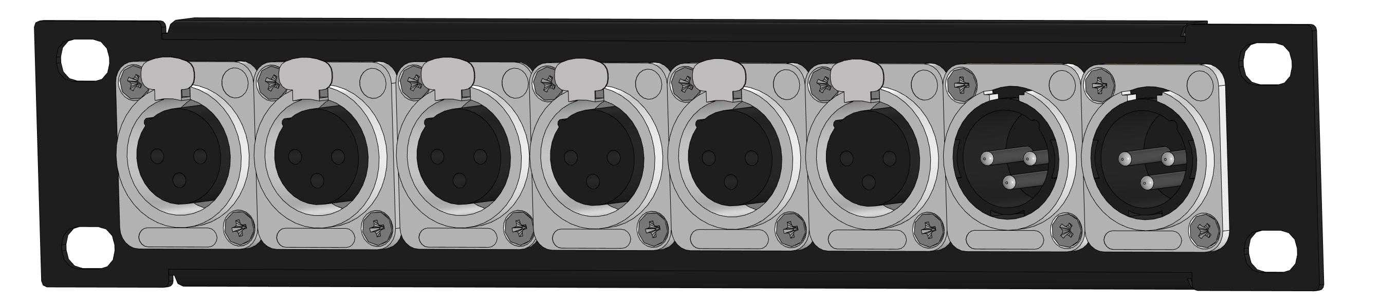 Оконечная аудио панель mini 8-кан. (6-IN/2-OUT), Standart, (6х XLR гнездо/2х XLR штекер), 1U, 10" для звуковых сигналов-XLR, D-посадка. Комплектующие: разъемы MRC RXDN-3F; MRC RXDN-3M; панель MRC ERP1U/H-08D
