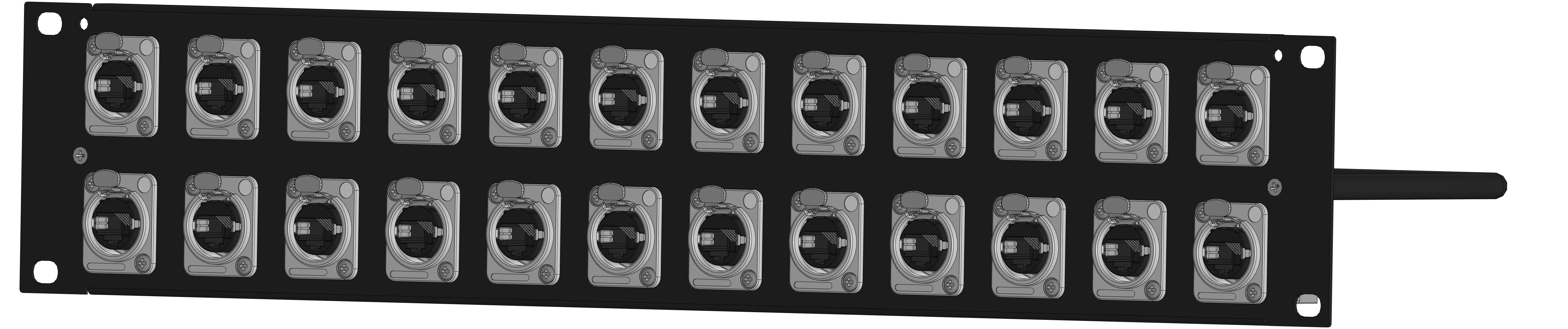 Оконечная панель 24-кан. EtherCON, 2U, 19" для сигналов управления и данных, проходной адаптер RJ45 "гнездо-гнездо", D- посадка, кабель-трейсер ( глубина 7,62 см) . Комплектующие: разъемы MRC RE8DN-FP; панель MrCable P2U-24D