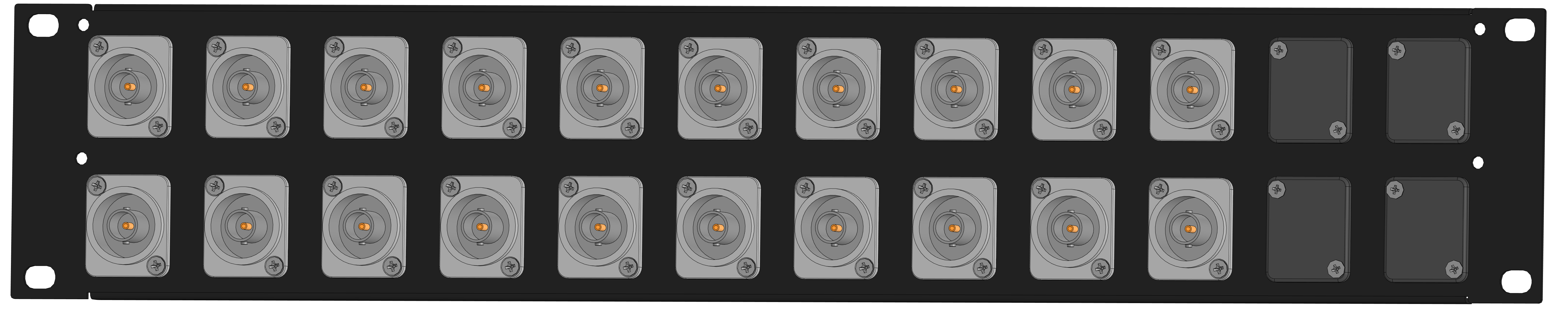 Оконечная видео панель 20-кан. BNC- проходное гнездо, 2U, 19", Standart 4K/8K, для аналоговых и цифровых видеосигналов UHD-BNC, D-посадка. Комплектующие: разъемы Neutrik NBB75DFGX; панель MRC RRP2U-24D-T, алюминий, (кабель-трейсер глубиной 10,5 см в комплекте)