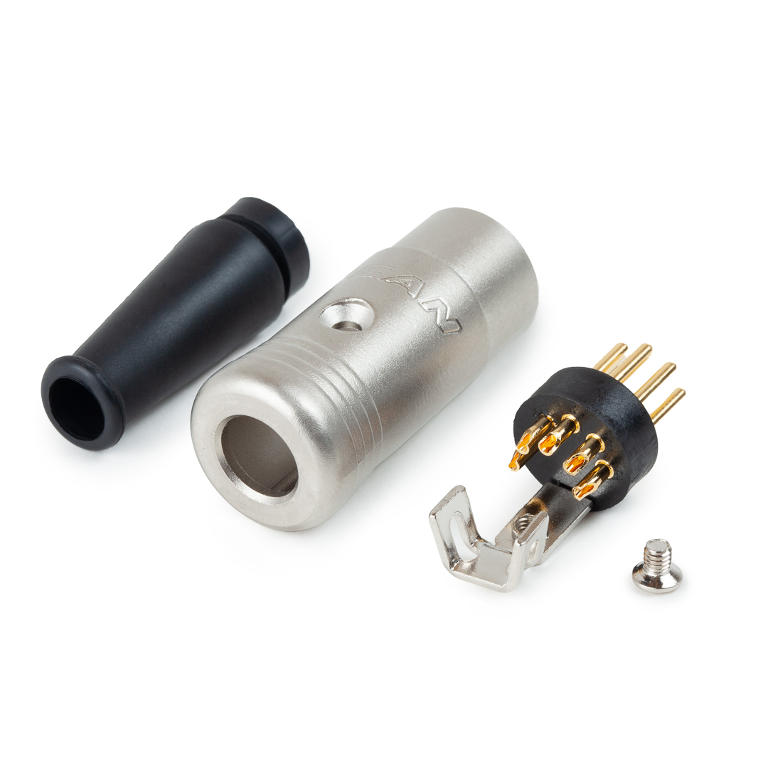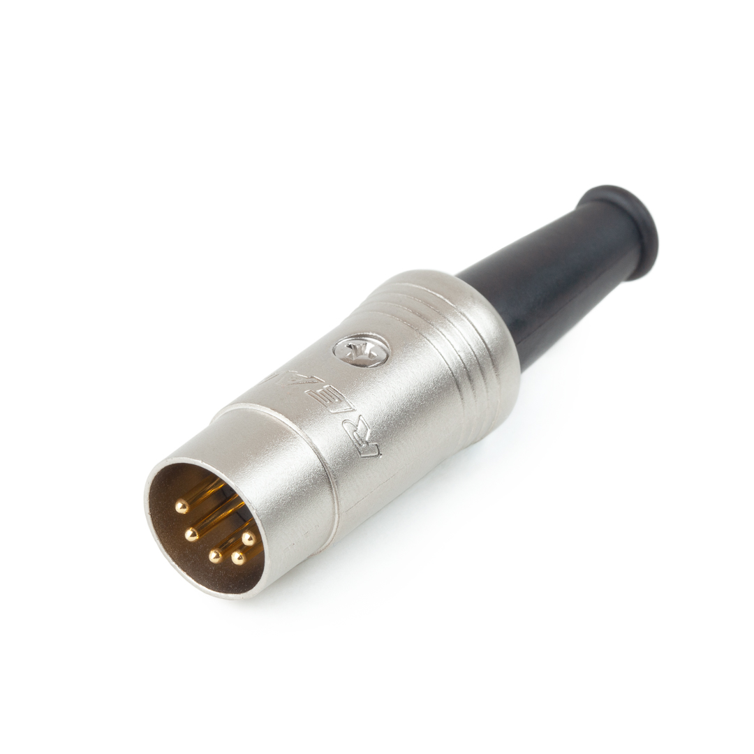 Кабельный разъем DIN, 5-и контактный, <штекер/папа>, металлический никелированный корпус, контакты - покрытие золото, резиновый хвостовик, на кабель диаметром 5.0 мм.