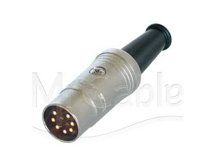 Кабельный разъем DIN, 7-и контактный, <штекер/папа>, металлический никелированный корпус, контакты - покрытие золото, резиновый хвостовик, на кабель диаметром 5.0 мм.