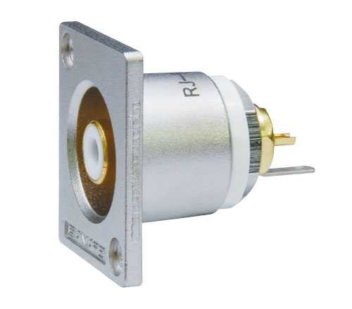 Панельный разъем RCA, <гнездо/мама>, черный фланец D-типа, металлический никелированный корпус, под пайку. КСВ 1.1 или меньше, частота до 50 МГц. Возможно использование с HDTV видеосигналами. Цвет изолятора: синий.