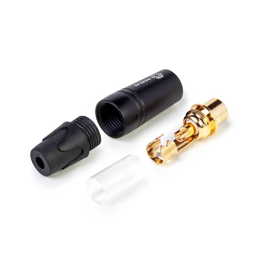 Кабельный разъем RCA, <гнездо/мама>, черный металлический корпус, резиновый хвостовик черного цвета, контакты покрытие - золото, под пайку, на кабель диаметром до 6 мм