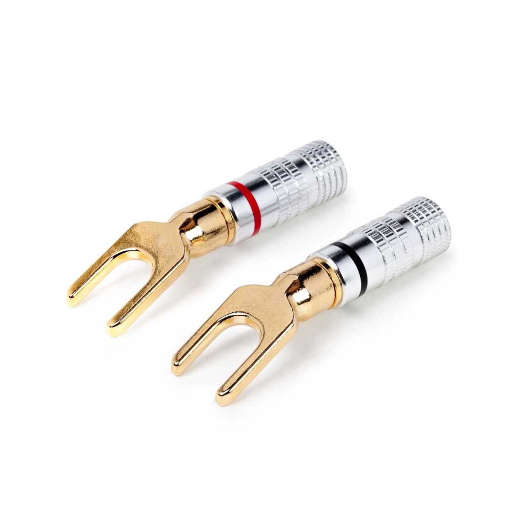 Кабельный разъем SPADE (лопатка) 45°, хромированный декоративный/защитный корпус из аллюминия, цельнометаллическая контактная часть с покрытием золотом, винтовая фиксация, на диаметр жилы до 6.0 мм. Комплект 2 шт. Маркировка: красная / черная