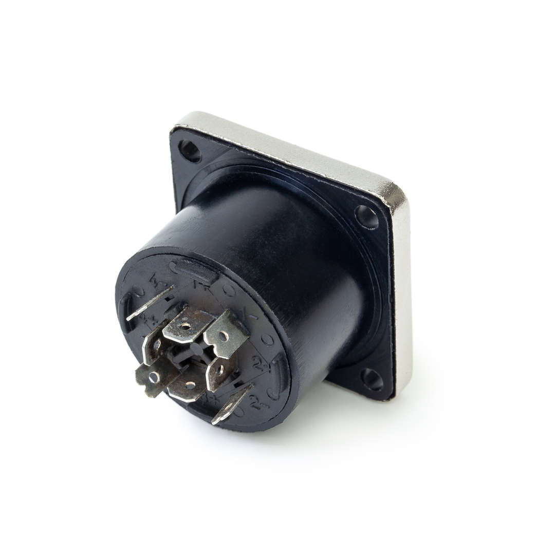 Панельный разъем SPEAKON для подключения громкоговорителей / усилителей, 8-и контактный <штекер/папа>, черный корпус из термопластика, квадратный металлический фланец G-типа, сквозные отверстия, плоские контакты 3/16 ", надежная поворотная система блокировки, оптимизирован для использования в динамиках, контакты - покрытие серебро, рабочее напряжение 250 В / ток 40 А, под пайку. Внимание! Разъёмы SpeakON рассчитаны на кратковременные пиковые нагрузки и не предназначены для передачи сетевого питания или постоянной силовой нагрузки!