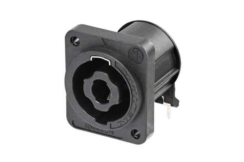 Панельный разъем SPEAKON серии XX, для подключения громкоговорителей / усилителей, 4-х контактный <штекер/папа>, черный корпус из термопластика, фланец D-типа, самонарезные отверстия для винтов (винтовые), горизонтальная установка PCB, надежная поворотная система блокировки, оптимизирован для использования в динамиках, контакты - покрытие серебро, рабочее напряжение 250 В / ток 25 А, под пайку, соответствует стандарту IEC 62368-1