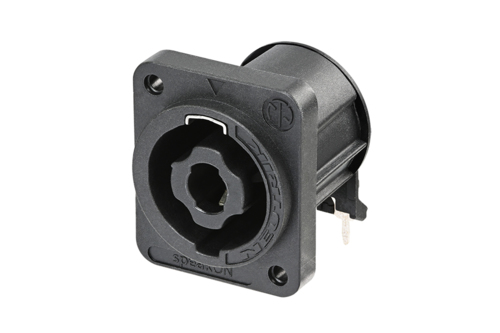 Панельный разъем speakON серии XX, для подключения громкоговорителей / усилителей, 4-х контактный <штекер/папа>, черный корпус из термопластика, фланец D-типа, самонарезные отверстия для винтов (винтовые), горизонтальная установка PCB, надежная поворотная система блокировки, оптимизироавн для использования в динамиках, контакты - покрытие серебро, рабочее напряжение 250 В / ток 25 А, под пайку, соответствует стандарту IEC 62368-1