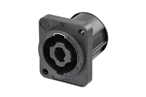 Панельный разъем SPEAKON серии XX, для подключения громкоговорителей / усилителей, 4-х контактный <штекер/папа>, черный корпус из термопластика, фланец D-типа, самонарезные отверстия для винтов (винтовые) - зеркальное расположение, вертикальная установка PCB, надежная поворотная система блокировки, оптимизирован для использования в динамиках, контакты - покрытие серебро, рабочее напряжение 250 В / ток 25 А, под пайку, соответствует стандарту IEC 62368-1