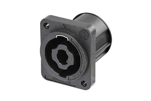 Панельный разъем SPEAKON серии XX, для подключения громкоговорителей / усилителей, 4-х контактный <штекер/папа>, черный корпус из термопластика, фланец D-типа, самонарезные отверстия для винтов (винтовые), вертикальная установка PCB, надежная поворотная система блокировки, оптимизирован для использования в динамиках, контакты - покрытие серебро, рабочее напряжение 250 В / ток 25 А, под пайку, соответствует стандарту IEC 62368-1
