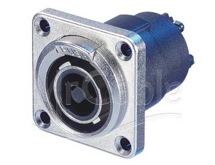Панельный разъем SPEAKON для подключения громкоговорителей / усилителей, туровое применение, 4-х контактный <гнездо/мама>, прочный влагостойкий металлический корпус, фланец G-типа, класс защиты (IP 54), контакты - покрытие серебро, подходит для проводов сечением до 6.0 мм2 (AWG 10), рабочее напряжение 250 В / ток 40 А, под пайку.