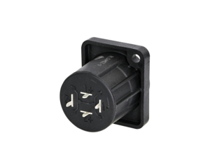 Панельный разъем SPEAKON для подключения громкоговорителей / усилителей, 4-х контактный <штекер/папа>, черный корпус из термопластика, фланец D-типа, надежная поворотная система блокировки, оптимизирован для использования в динамиках, контакты - покрытие серебро, под пайку, рабочее напряжение 250 В / ток 30 А