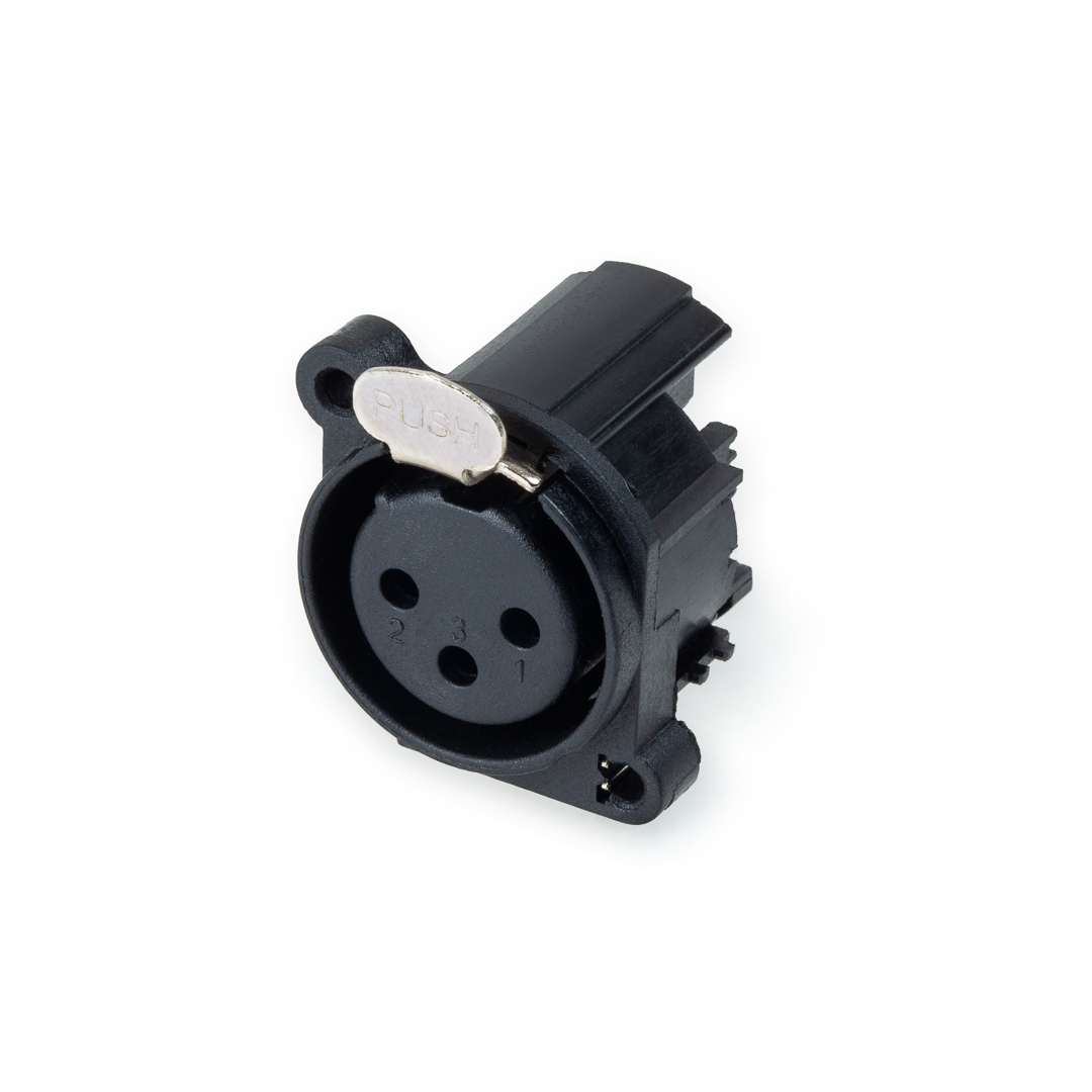 Панельный разъем XLR, 3-х контактный <гнездо/мама>, А-серия, фланец А-типа, горизонтальная установка PCB, компактный пластиковый корпус, заземление: без заземляющего контакта, контакты - покрытие золото, под пайку.
