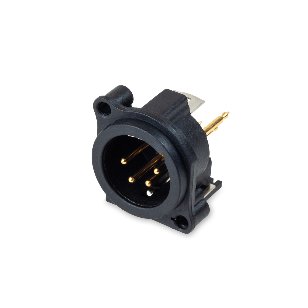 Панельный разъем XLR, 4-х контактный <штекер/папа>, А-серия, фланец А-типа, вертикальная установка PCB, корпус из термопластика, заземление: отдельный контакт заземления - корпус разъема - корпус установки соединены, возможна цветовая маркировка, контакты - покрытие золото, под пайку.