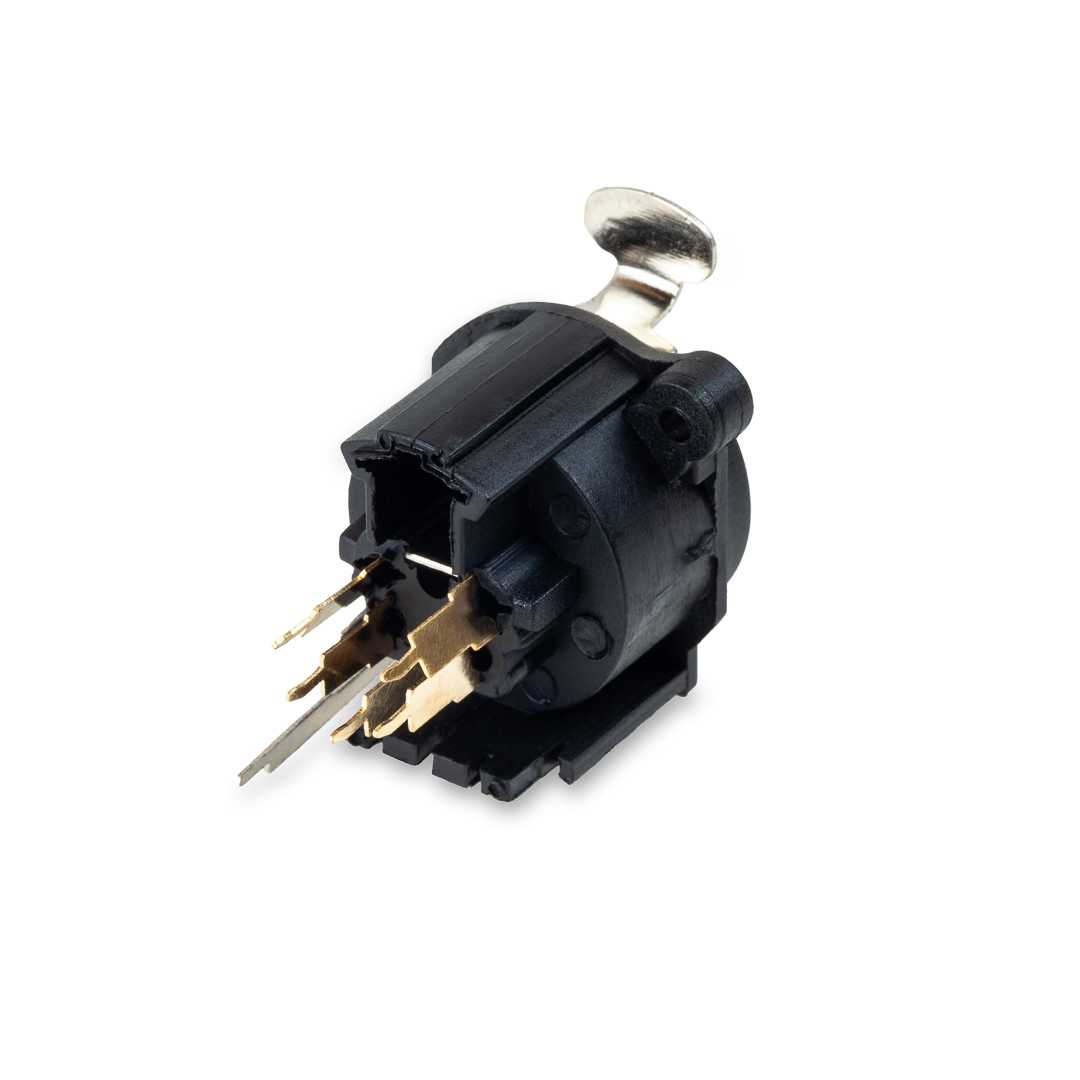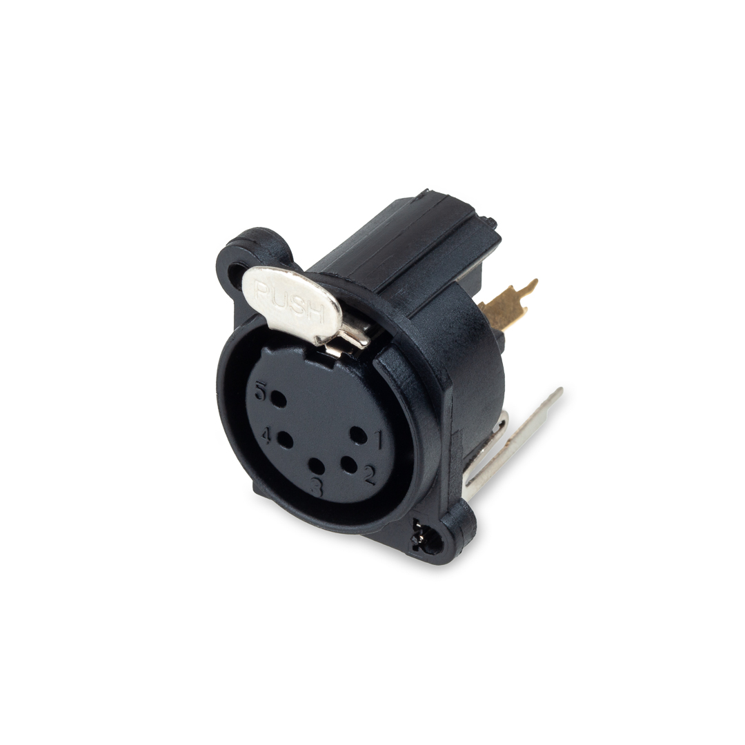 Панельный разъем XLR, 5-и контактный <гнездо/мама>, А-серия, фланец А-типа, вертикальная установка PCB, компактный корпус из термопластика, заземление: отдельный контакт заземления - корпус разъема - корпус установки соединены, контакты - покрытие золото, под пайку.