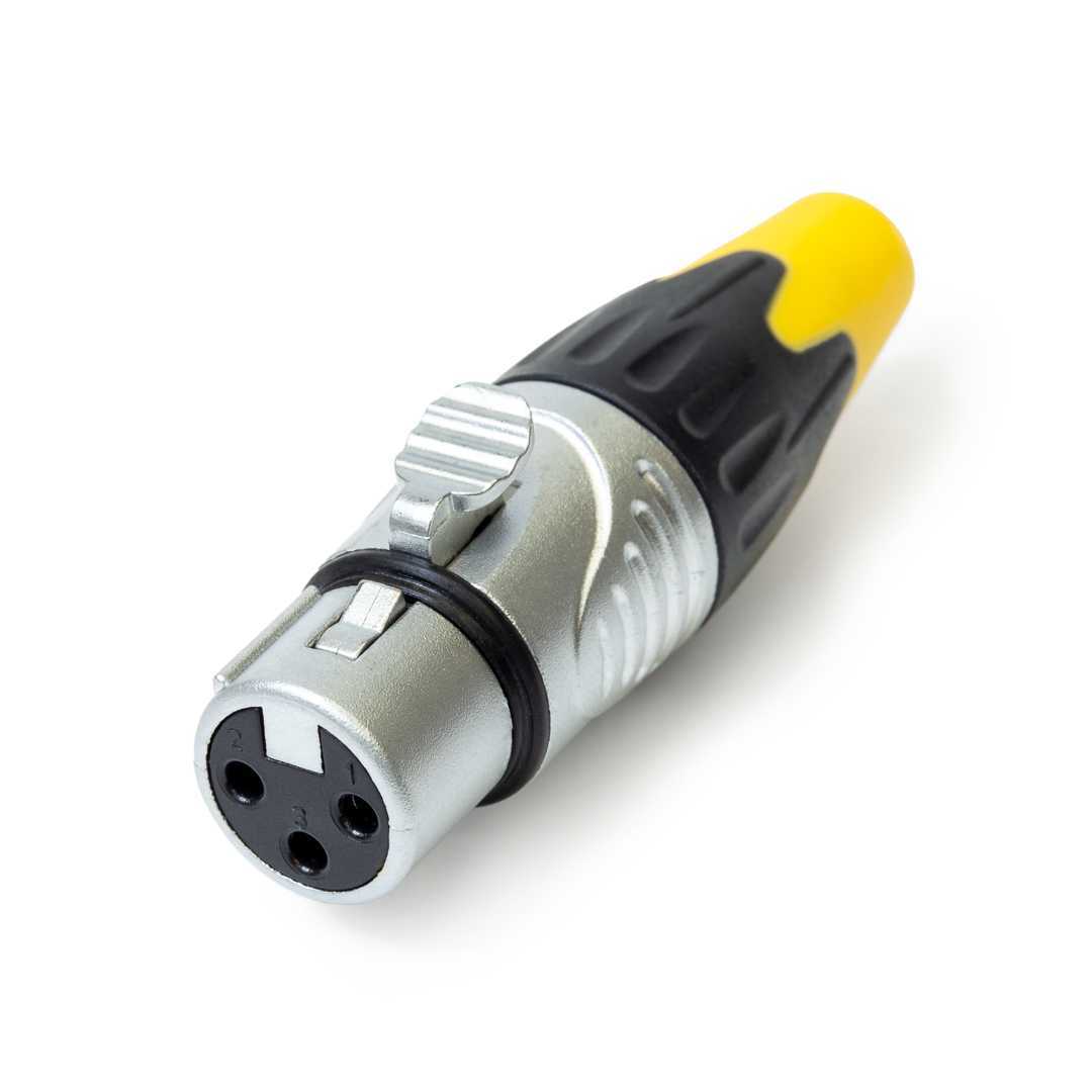 Кабельный разъем XLR, 3-х контактный <гнездо/мама>, А-серия, металлический никелированный корпус, контакты - покрытие серебро, под пайку, зажимной патрон, черно-желтый хвостовик (доступно 2- цвета, красный и черный), на кабель диаметром до 8.0 мм