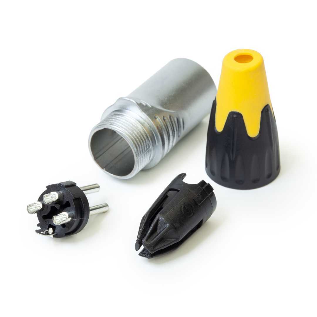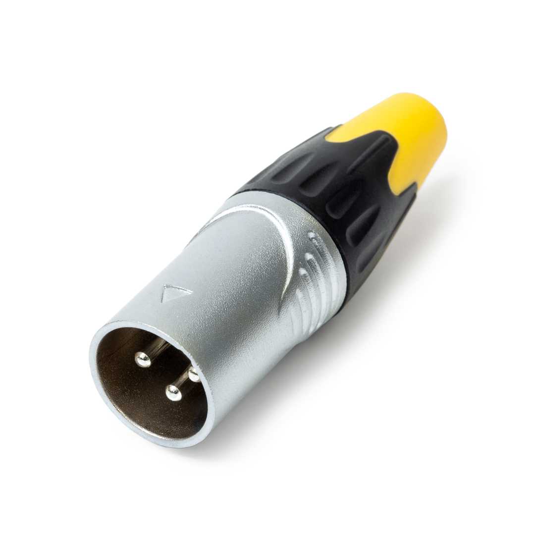 Кабельный разъем XLR, 3-х контактный <штекер/папа>, А-серия, металлический никелированный корпус, контакты - покрытие серебро, под пайку, зажимной патрон, черно-желтый хвостовик (доступно 2- цвета, красный и черный), на кабель диаметром до 8.0 мм