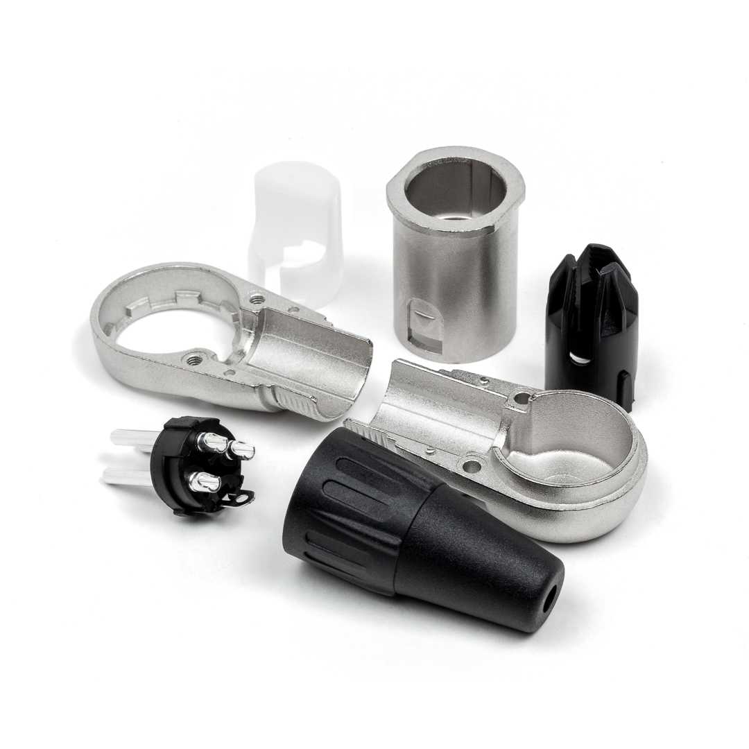 Кабельный разъем XLR, 3-х контактный <штекер/папа>, угловой, Е-серия, 5 положений вывода кабеля, металлический никелированный корпус, контакты - покрытие серебро, под пайку, полиуретановый колпачок на кабель диаметром (3.5-8.0 мм)