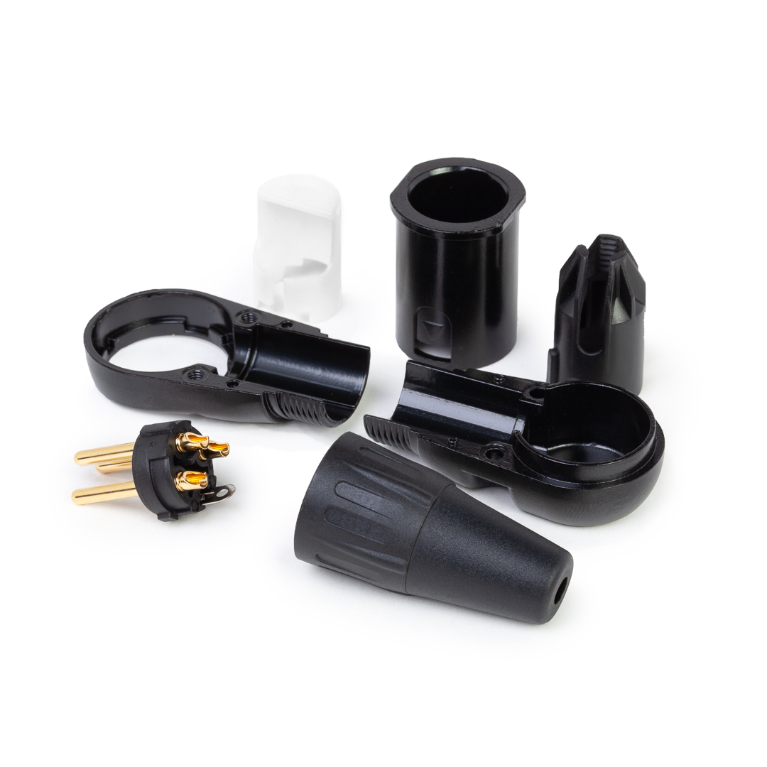 Кабельный разъем XLR, 3-х контактный <штекер/папа>, угловой, E-серия, 5 положений вывода кабеля, черный металлический корпус, контакты - покрытие золото, под пайку, полиуретановый колпачок на кабель диаметром (3.5-8.0 мм)