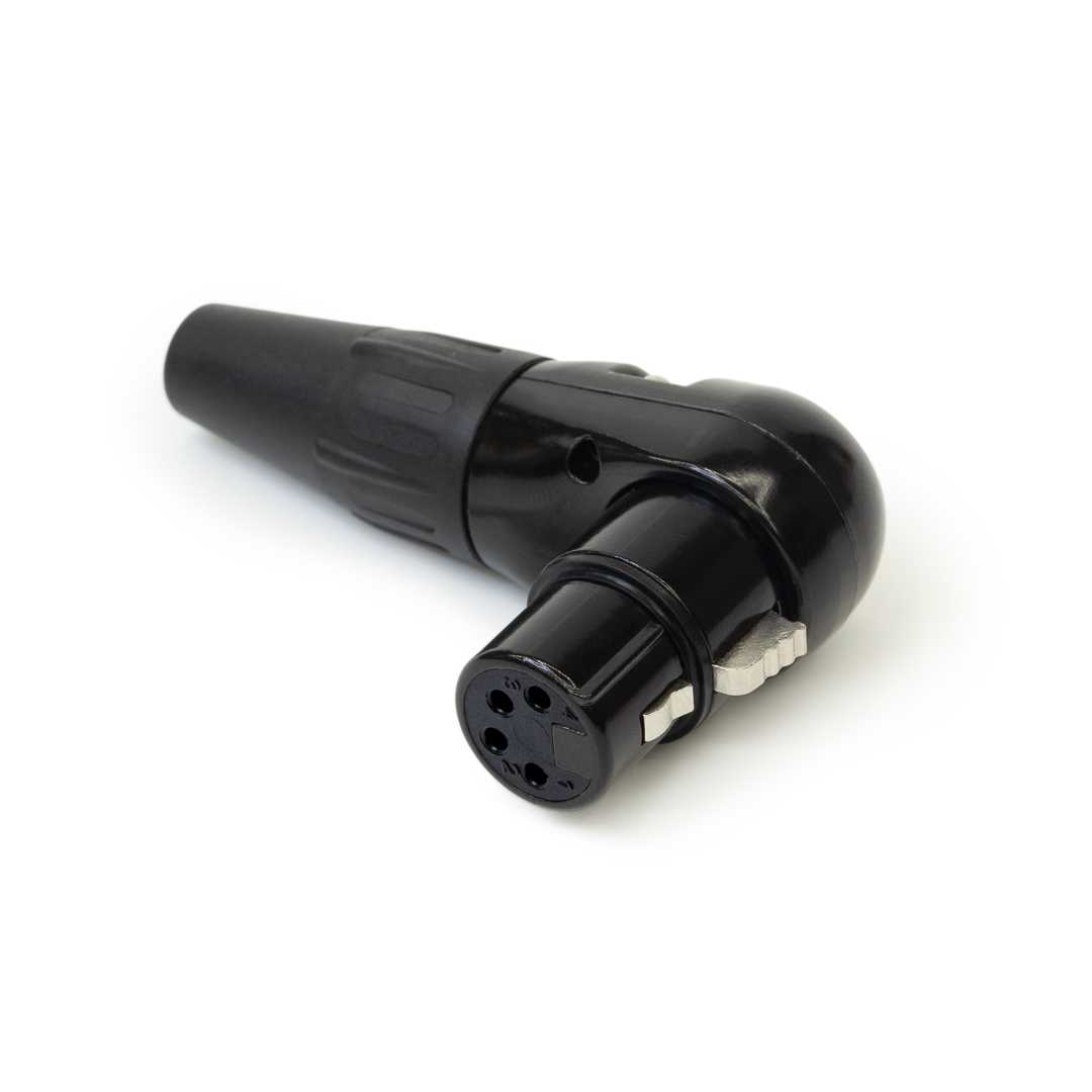 Кабельный разъем XLR, 4-х контактный <гнездо/мама>, угловой, E-серия, 5 положений вывода кабеля, черный металлический корпус, контакты - покрытие золото, под пайку, полиуретановый колпачок на кабель диаметром (3.5-8.0 мм)