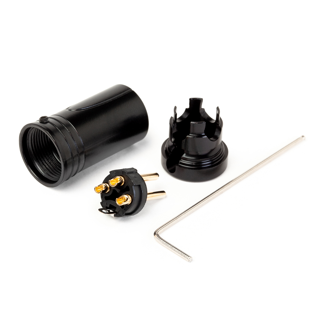 Кабельный разъем XLR, 3-х контактный <штекер/папа>, угловой, укороченный корпус, W-серия, вывод кабеля под углом 90° со свободным выбором направления, черный металлический корпус, контакты - покрытие золото, под пайку, на кабель диаметром (3.5-4.0 мм)