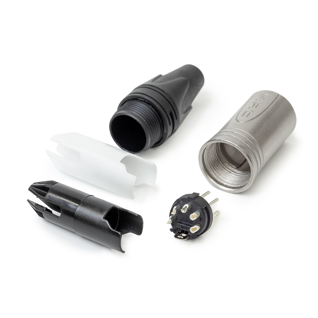Кабельный разъем XLR, 5-и контактный <штекер/папа>, X-серия, металлический никелированный корпус, контакты - покрытие серебро, под пайку, зажимной патрон, пластиковый колпачок на кабель диаметром (3.0-8.0 мм)
