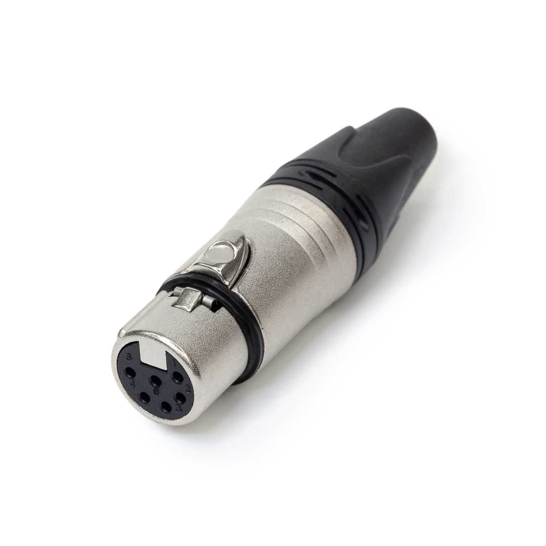 Кабельный разъем XLR, 6-и контактный <гнездо/мама>, X-серия, металлический никелированный корпус, контакты - покрытие серебро, под пайку, зажимной патрон, пластиковый колпачок на кабель диаметром (3.0-8.0 мм)