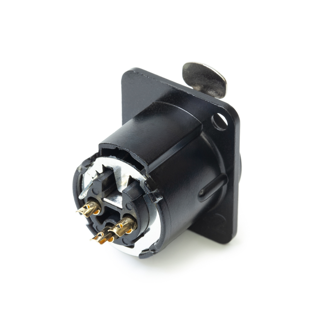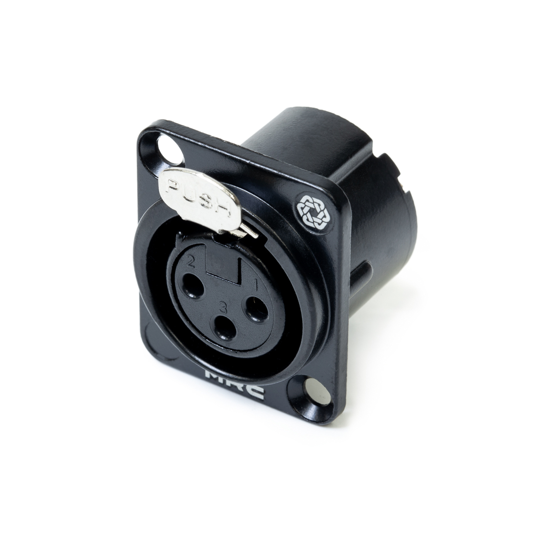 Панельный разъем XLR, 3-х контактный <гнездо/мама>, А-серия, фланец D-типа, черный металлический корпус, контакты - покрытие золото, под пайку
